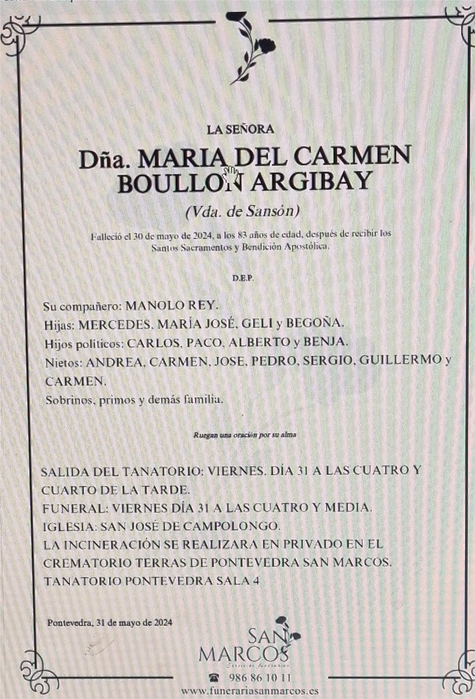 La funeraria SAN MARCOS comunica que en la sala 4 del tanatorio San Mauro en Pontevedra se velan los restos mortales de Doña María del Carmen Boullón Argibay, fallecida ayer día 30, hasta el momento de su traslado para su incineración en la intimidad familiar, que se efectuará hoy viernes día 31 a las cuatro y cuarto de la tarde en la intimidad familiar.