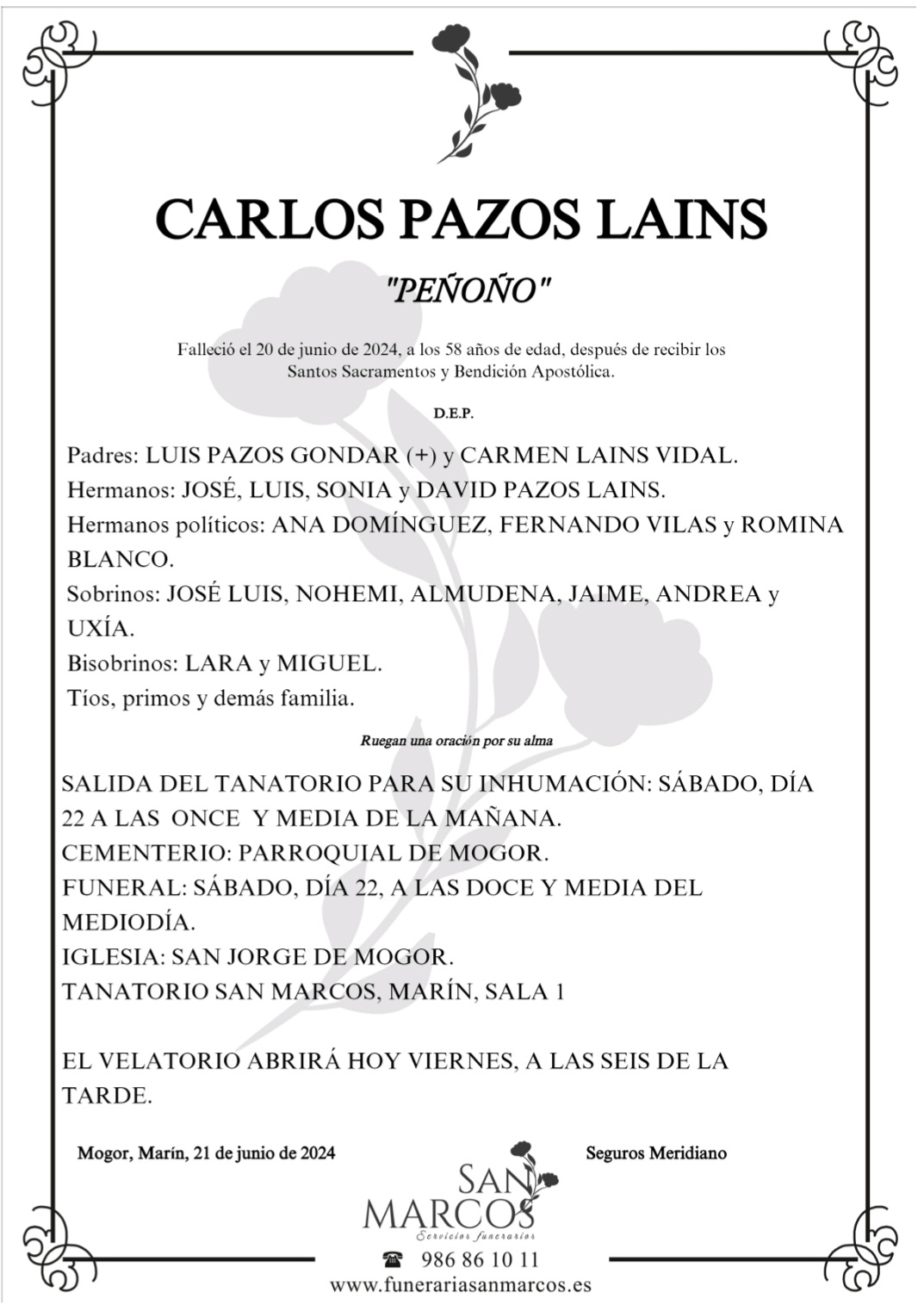 La funeraria SAN MARCOS comunica que, en la sala 1 del tanatorio en Marín, se velan los restos mortales de Carlos Pazos Laíns “Peñoño”, fallecido ayer día 20, hasta el momento de su traslado para su inhumación en el cementerio parroquial de Mogor mañana sábado día 22 a las once y media de la mañana.