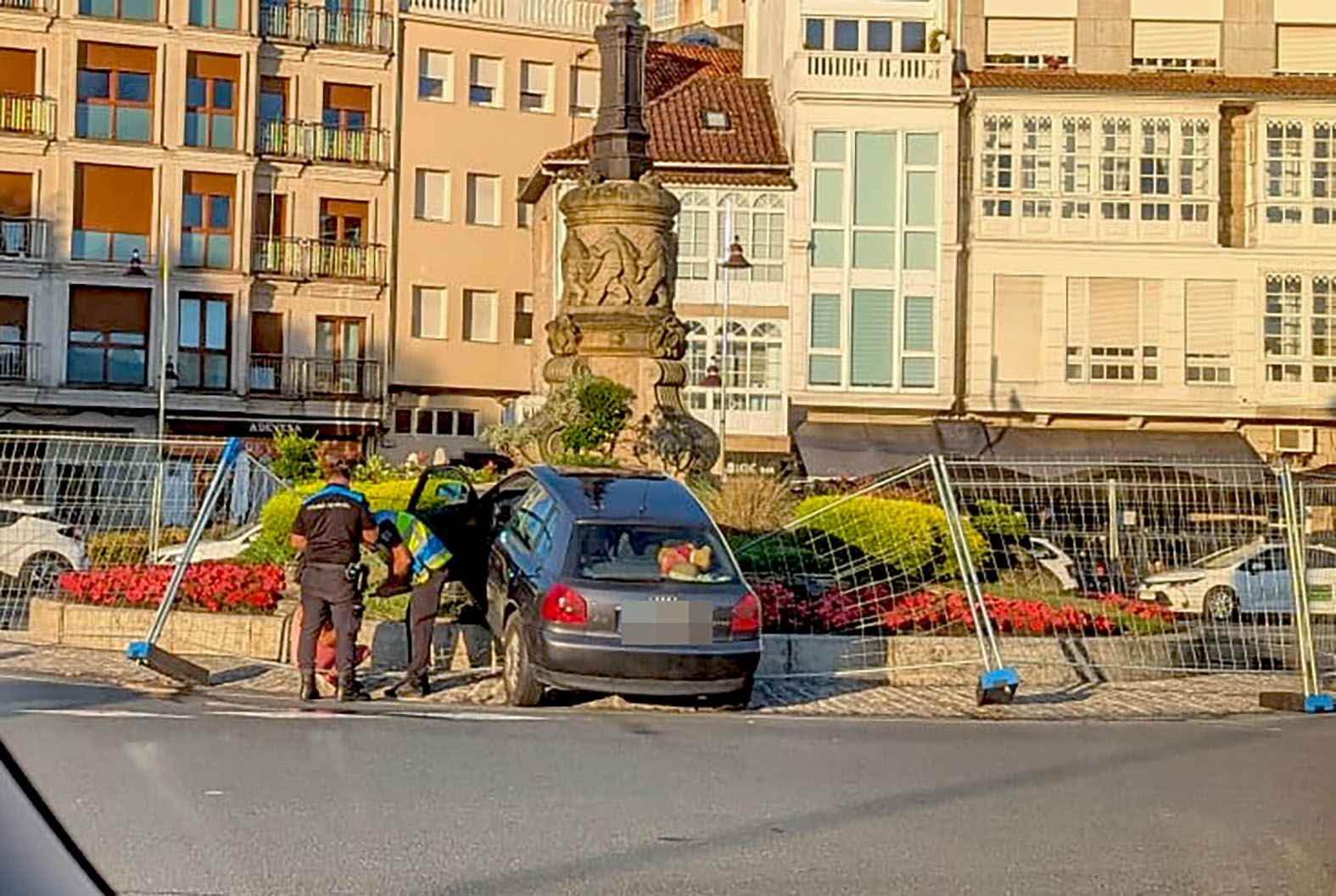 Una conductora perdió el control de su vehículo a primera hora de esta mañana en la plaza de España después de un pequeño choque con otro vehículo y fue a impactar contra unas vallas instaladas por operarios municipales que rodean la Farola para protegerla durante las fiestas. No hay que lamentar heridos, solamente algunos daños en el propio vehículo y en alguno de los paneles de protección, que hizo de rampa y provocó que el coche acabase encima de los parterres al pie de la Farola.