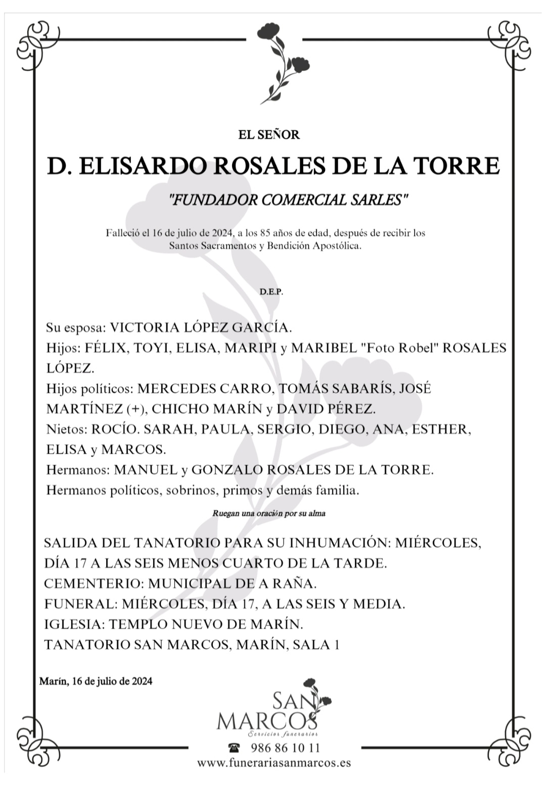 La funeraria SAN MARCOS comunica que, en la sala 1 de su tanatorio en Marín, se velan los restos mortales de DON ELISARDO ROSALES DE LA TORRE, fallecido HOY día 16, hasta el momento de su traslado para su inhumación en el cementerio municipal de A RAÑA mañana miércoles día 17 a las seis menos cuarto de la tarde.