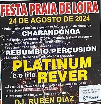 Loira celebra pasado mañana sábado su tradicional fiesta popular del mes de agosto afamada por la tirada de fuegos artificiales seguidas por tierra y mar ya que hay varias empresas de transporte marítimo que organizan viajes para esa noche conteniendo la visión de los fuegos que se lanzan a medianoche en la misma playa por la empresa Argimiro Albores.