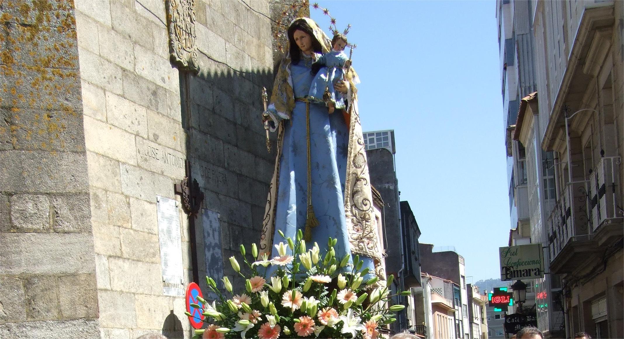 Eran las fiestas de mi pueblo los días grandes de La Patrona en los que casi siempre llovía, y de ahí que se decidió, no recuerdo cuándo ni por quien, trasladar la fuerza de la fiesta popular al 16 de Julio, en la que en aquellos años se celebraban con el gaiteiro la noche anterior en la Plaza del Reloj como cualquier otro día en honor a cuanta santa o santo hay en el santoral de la parroquia porque cada uno o una tenía su propia cofradía organizadora.