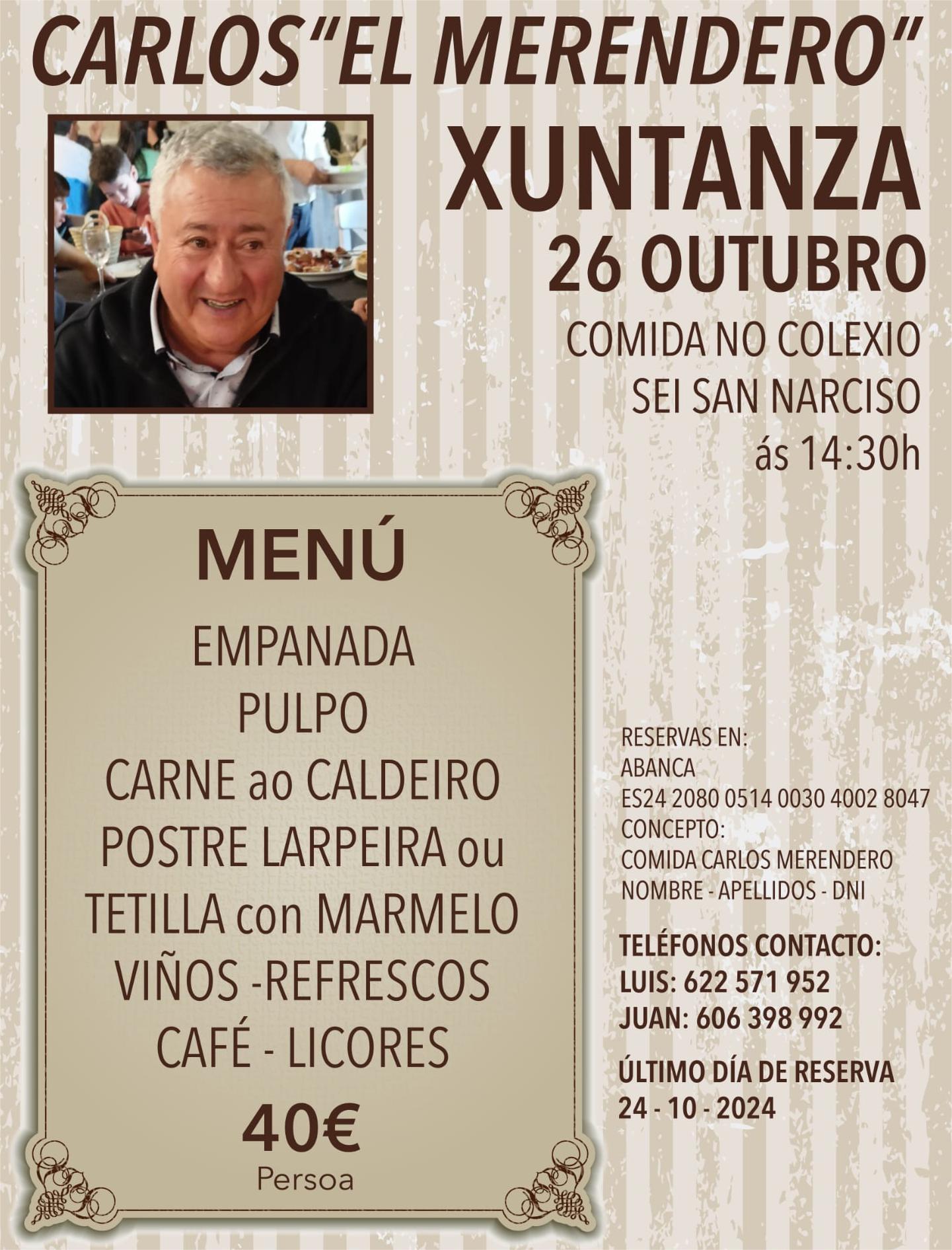 Desde la organización se recuerda que, para asistir al homenaje, es preciso inscribirse previamente y como límite, hasta el día 24 al objeto de organizar debidamente el evento, y para ello hay dos opciones, una, que miembros de la organización del homenaje (Luis tfno. 622571952 y Juan, tfno. 606398992) llevan tarjetas de participación, y la otra, que también se puede hacer directamente mediante ingreso de 40 los euros en la cuenta abierta en ABANCA para este fin, ES24 2080 0514 0030 4002 8047 que cerrará esta posibilidad precisamente en esa misma fecha. La organización avisa que difícilmente por no decir imposible, se podrán admitir solicitudes una vez cerrado el plazo por lo que ruegan a los interesados que realmente lo estén que procuren, como suele ocurrir, no dejar la cosa de mano porque será materialmente imposible incluir a más personas tras el cierre del plazo.