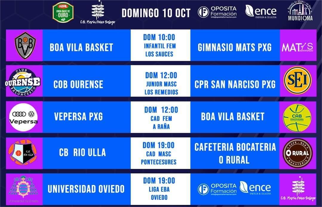 Este fin de semana contiene una intensa actividad de los equipos del club de baloncesto “Peixe galego” cuyo conjunto de FEB “Oposita Marín ENCE Peixegalego” viaja a Oviedo donde dará sus primeros pasos en la competición dado que la primera jornada hubo de ser suspendida a causa del temporal que afectó a las instalaciones del pabellón de A Raña.