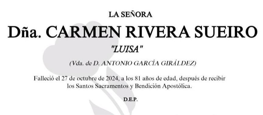 La funeraria San Marcos comunica el fallecimiento, hoy domingo día 27 de doña CARMEN RIVERA SUEIRO cuyos restos mortales se velan en la sala número 2 del Tanatorio San Marcos de Marín, hasta el momento de su salida, mañana LUNES día 28, a las SEIS Y CUARTO de la tarde para su inhumación en el cementerio municipal de A Raña..
