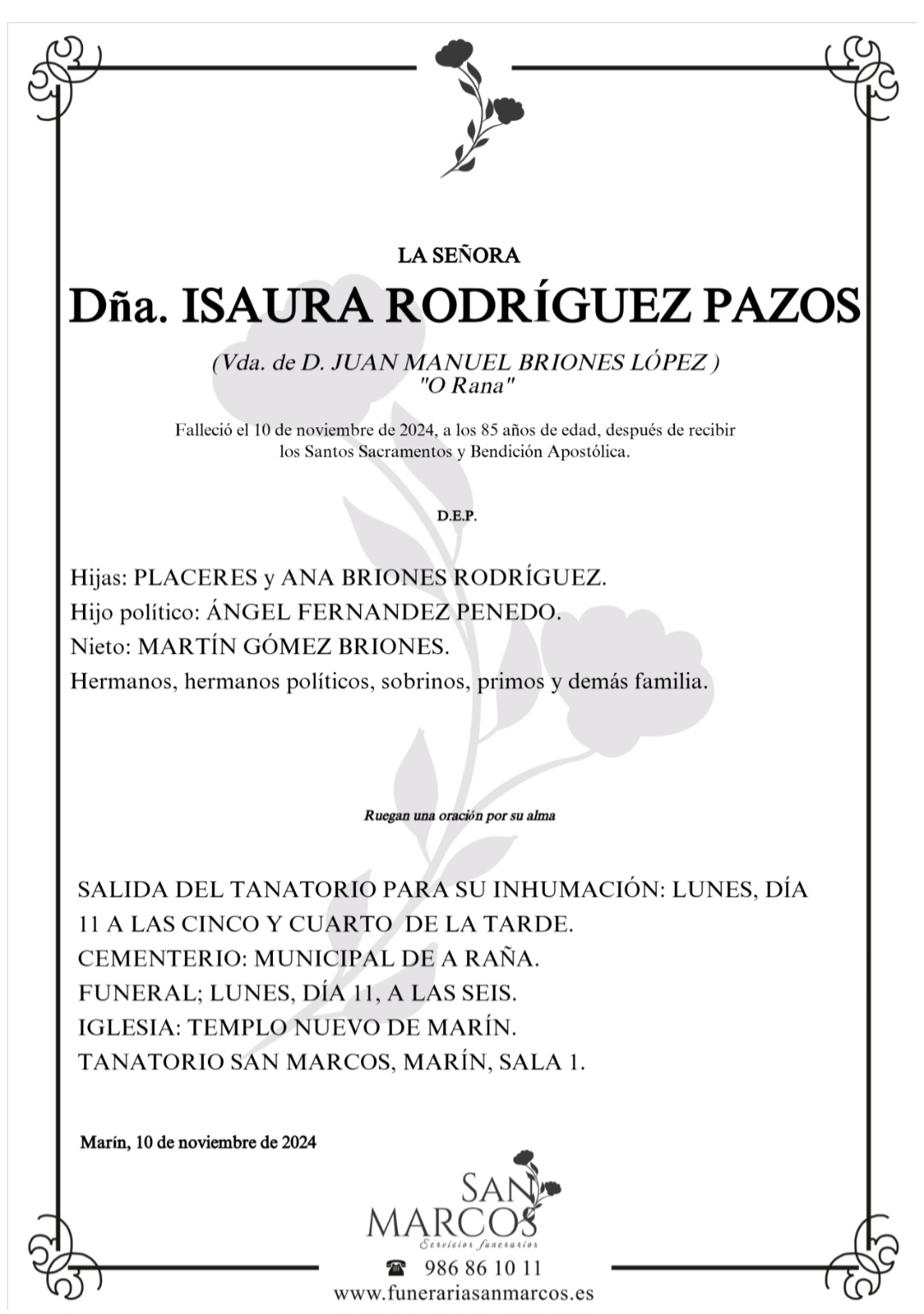 La funeraria San Marcos comunica el fallecimiento, hoy DOMINGO día 10 de Doña ISAURA RODRÍGUEZ PAZOS, viuda de Juan Manuel Briones López, “O Rana” cuyos restos mortales se velan en el Tanatorio San Marcos de Marín, sala número 1, hasta el momento de su salida, mañana LUNES día 11, a las CINCO Y CUARTO de la tarde para su inhumación en el cementerio municipal de A Raña