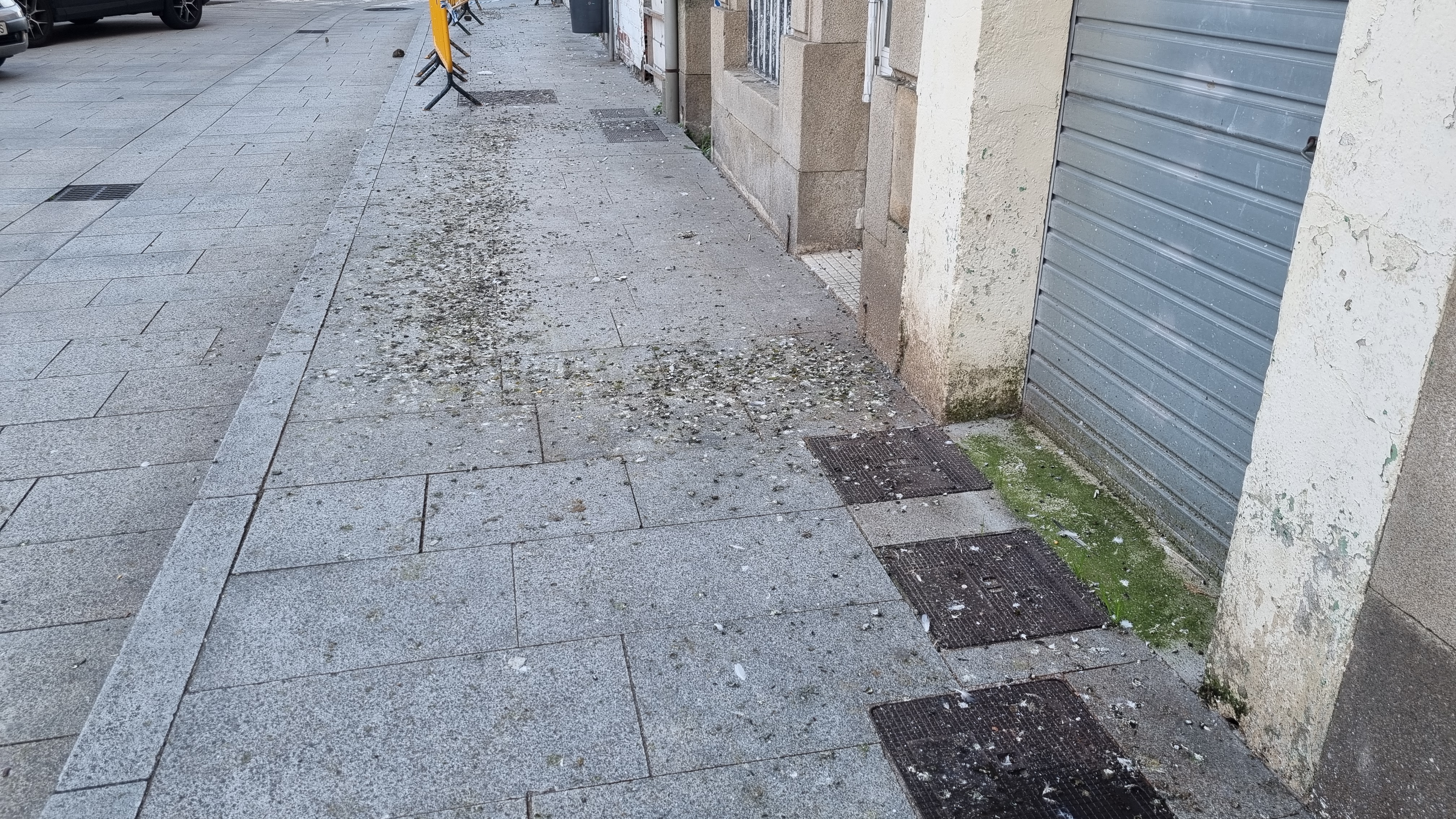La tercera también relacionada con este problema, se sitúa justo frente a la Plaza de Abastos, entrada principal,. Otro edificio que lleva más de treinta años en ladrillo, porque se impidió en su día su finalización, y en el que se albergan cientos de palomas que ponen el peligro de patinaje libre en la acera sobre todo cuando llueve y se hace una pasta resbaladiza.