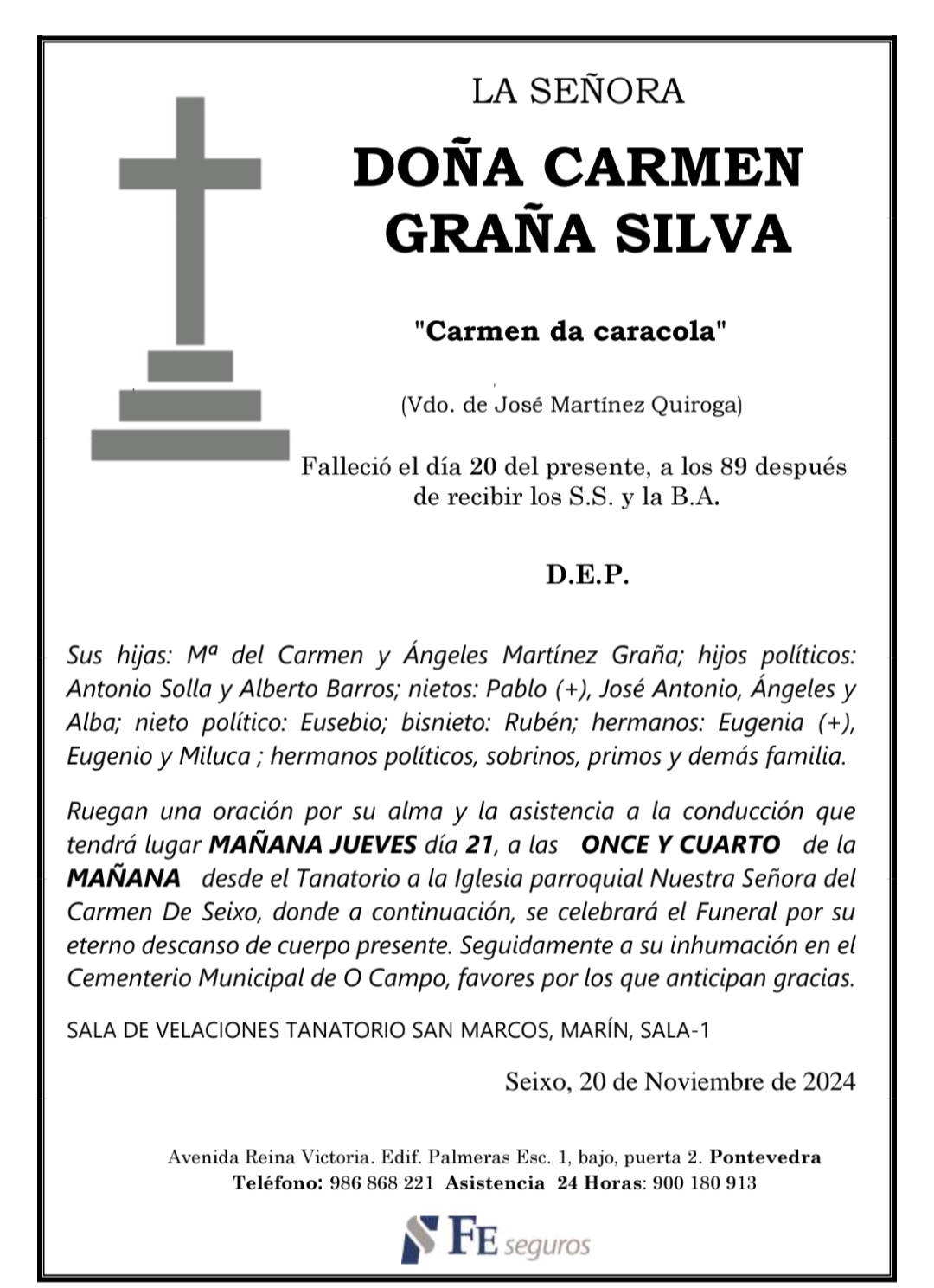 La funeraria LA FE comunica el fallecimiento, hoy día 20 de Doña CARMEN GRAÑA SILVA, cuyos restos mortales se velan en el “Tanatorio San Marcos ”, en Marín, sala número 1, hasta el momento de su salida, mañana JUEVES día 21, a las ONCE Y CUARTO de la mañana a la Iglesia parroquial de Nuestra Señora del Carmen, en Seixo, y tras el funeral por su eterno descanso, al cementerio municipal de O Campo para su inhumación. D.E.P.