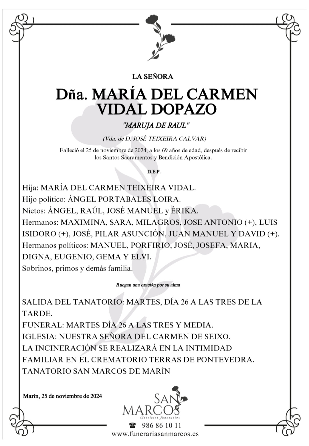 La funeraria SAN MARCOS comunica el fallecimiento, hoy día 25 de Doña MARÍA DEL CARMEN VIDAL DOPAZO, cuyos restos mortales se velan en su tanatorio de Marín hasta el momento de su traslado, mañana martes, día 26 a las TRES de la tarde . La incineración se llevará a cabo en el crematorio Terras de Pontevedra en la intimidad familiar y el funeral por su alma se oficiará también mañana martes día 26 a las tres y media de la tarde en la iglesia parroquial de Nuestra Señora del Carmen de Seixo. DEP.