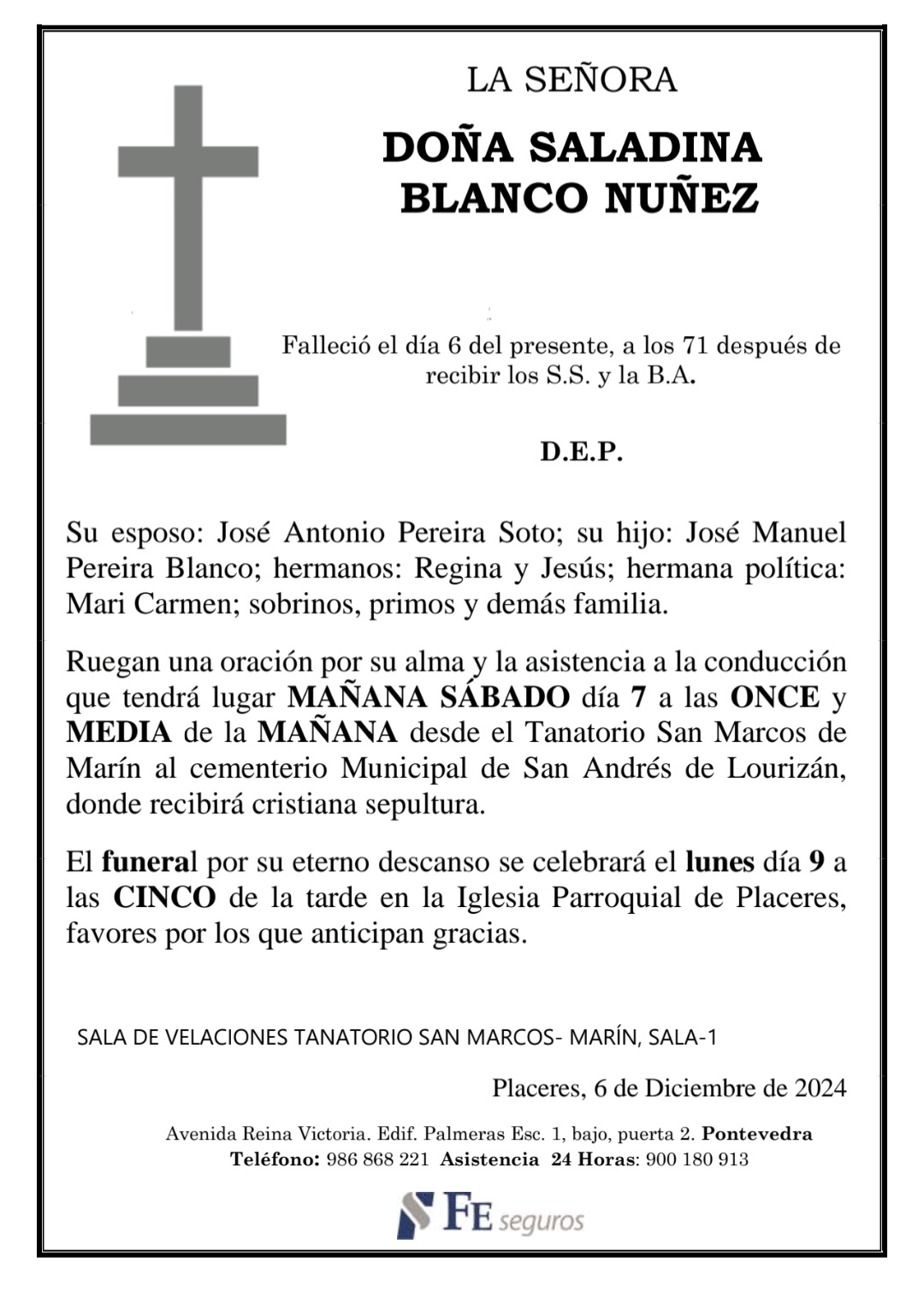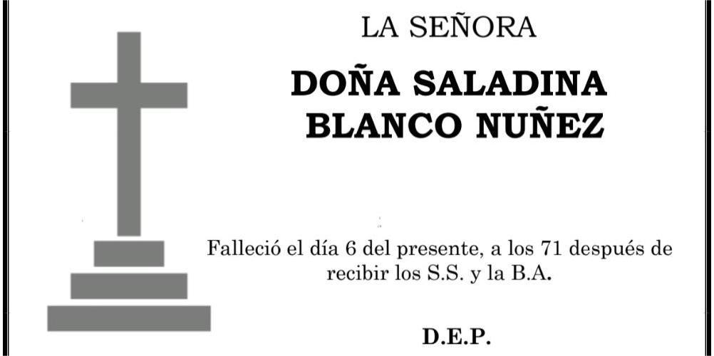 La funeraria LA FE comunica el fallecimiento, hoy día 6 de Doña SALADINA BLANCO NÚÑEZ cuyos restos mortales permanecen en la sala número 1 del Tanatorio San Marcos de Marín hasta el momento de su traslado, mañana sábado día 7 a las ONCE y MEDIA de la mañana, al cementerio municipal de San Andrés de Lourizán para su inhumación.