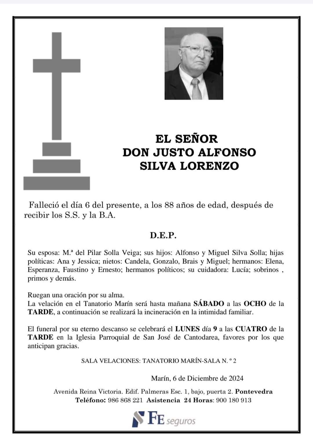 La funeraria LA FE comunica el fallecimiento, hoy día 6 de Don JUSTO ALFONSO SILVA LORENZO cuyos restos mortales permanecen en la sala número 2 del Tanatorio Marín hasta el momento de su traslado, mañana sábado día 7 a las OCHO DE LA TARDE, para su incineración en la intimidad familiar.