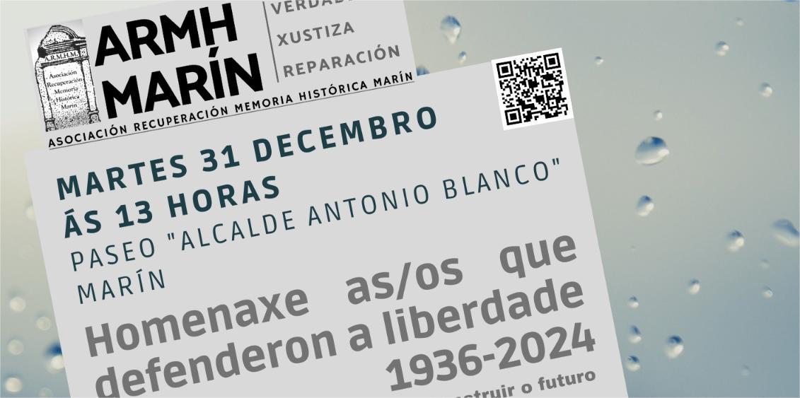 Segúndo indican no comunicado de convocatoria, desde o colectivoorganizador “Na memoria de Albino Agraso Santamaría, Antonio Blanco Solla, Amando Iglesias Pérez, Demetrio Lorenzo Ordóñez, Santiago Ramos Ramos, Bernardino de la Torre Fernández, fusilados o 31 de decembro de 1936, e das veciñas e veciños que defenderon a liberdade durante a represión franquista, a ARMH de Marín organiza o acto anual de homenaxe e lembranza no Paseo "Alcalde Antonio Blanco", o vindeiro martes día 31, ás 13 horas, no que contaremos coa participación do escritor e investigador Xosé Álvarez Castro. Intervirán Queta Otero e Xulio Pardellas, por parte da asociación, Uxía Lubián Pardellas, coa lectura dun texto, e acompañaranos a música de Ulises Trío”.