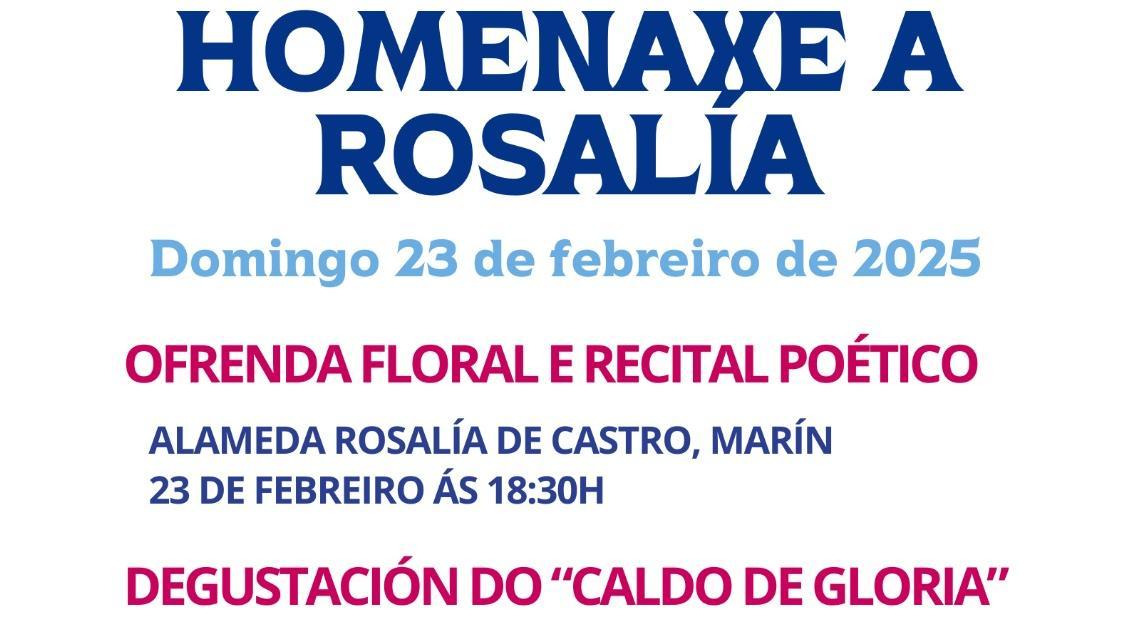 O BNG de Marín organiza unha homenaxe o domingo 23 de febreiro para conmemorar o aniversario de Rosalía de Castro, cunha xornada de celebración, memoria e identidade que incluirá ás 18:30 un recital poético e unha ofrenda floral na Alameda Rosalía de Castro, seguido ás 19:15 pola degustación do tradicional "Caldo de Gloria" na Praza da Veiguiña