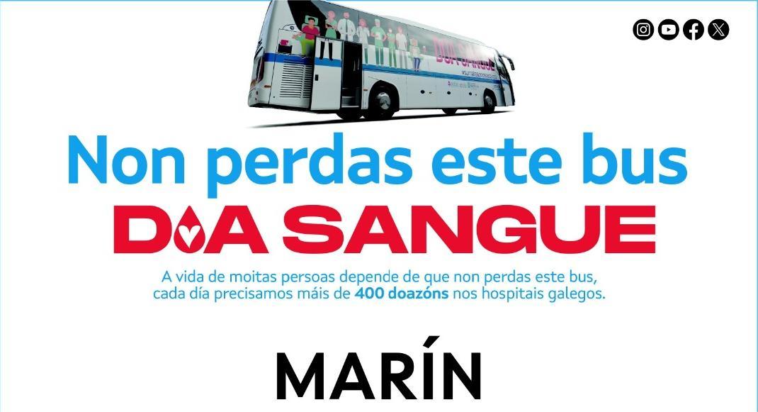 A Unidade Móbil de Doación de Sangue visita unha vez máis o municipio de Marín onde se apostará no recinto da alameda Rosalía de Castro á espera da aportación que fagan os veciños e visitantes que suban ao autobús que ven sendo unha unidade especialmente importante para surtir aos hospitais galegos do preciado líquido que pode salvar moitas vidas gracias a xenerosidade das persoas que superan as barreiras que lle impón a práctica da donación (todo é a primeira impresión) e posibilitan o almacenaxe de sangue co que atender operacións quirúrxicas, transfusións y tamén accidentes de todo tipo cuias víctimas a precisan.