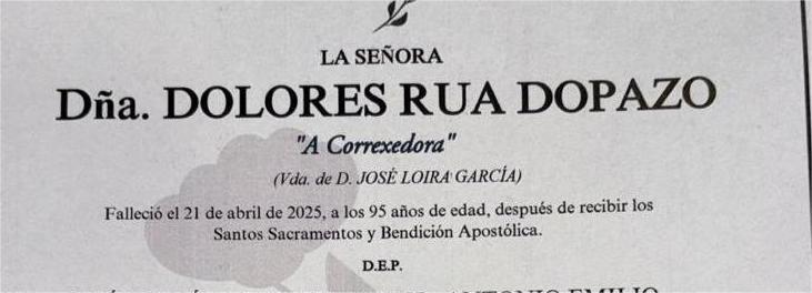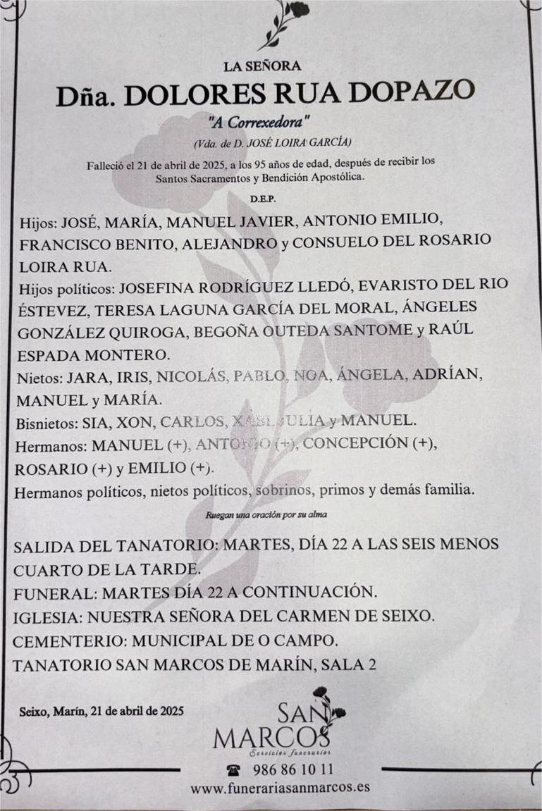 La funeraria SAN MARCOS comunica el fallecimiento hoy día 21 de abril de Doña DOLORES RÚA DOPAZO cuyos restos mortales permanecerán en el Tanatorio SAN MARCOS, de Marín, sala número 2, hasta el momento de su traslado, mañana martes día 22 de abril a las seis menos cuarto de la tarde para su inhumación al el cementerio municipal de O Campo.