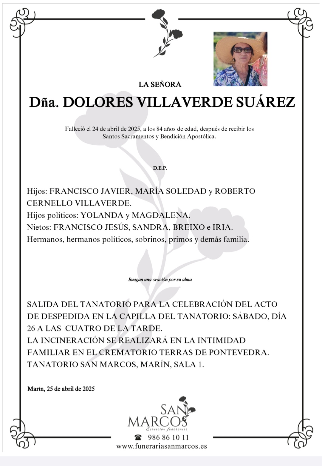 La funeraria SAN MARCOS comunica el fallecimiento el día 24 de abril de Doña DOLORES VILLAVERDE SUÁREZ cuyos restos mortales permanecerán en el Tanatorio SAN MARCOS, de Marín hasta el momento de su traslado, MAÑANA SÁBADO día 26 de abril a las cuatro de la tarde para su incineración en el crematorio Terras de Pontevedra en la intimidad familiar .