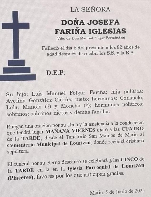 La funeraria SAN MARCOS comunica el fallecimiento hoy, día 5 de junio, de doña JOSEFA FARIÑA IGLESIAS cuyos restos mortales permanecerán en el Tanatorio SAN MARCOS, de Marín, hasta el momento de su traslado, MAÑANA VIERNES día 6 de junio a las CUATRO de la tarde al Cementerio Municipal de Lourizán para su inhumación.
