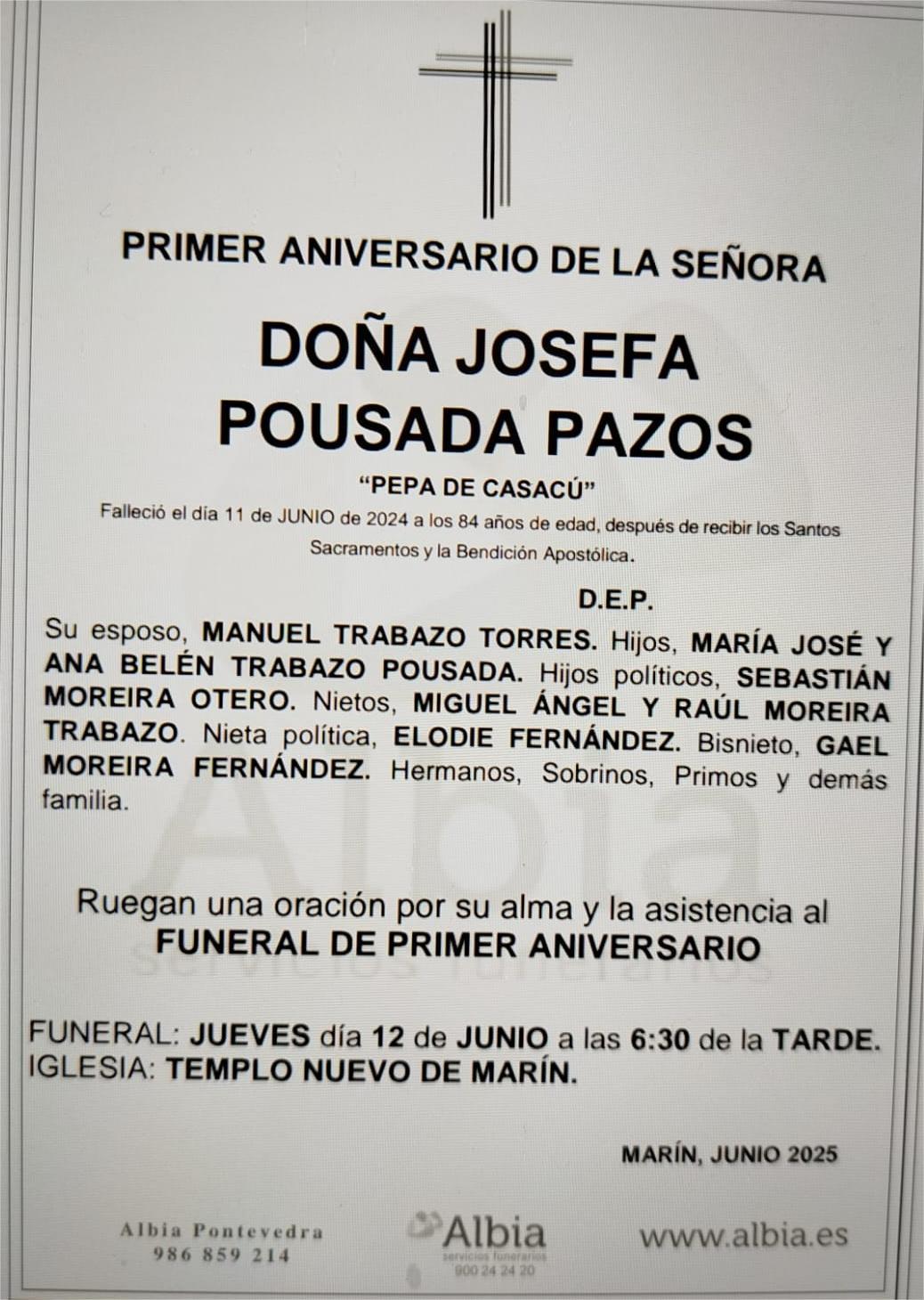 La funeraria ALBIA comunica que hoy, día 12 de junio, tendrá lugar la celebrción de la Misa de Primer Aniversario en recuerdo de Doña JOSEFA POUSADA PAZOS, fallecida el 11 de junio de 2024 a los 84 años de edad.