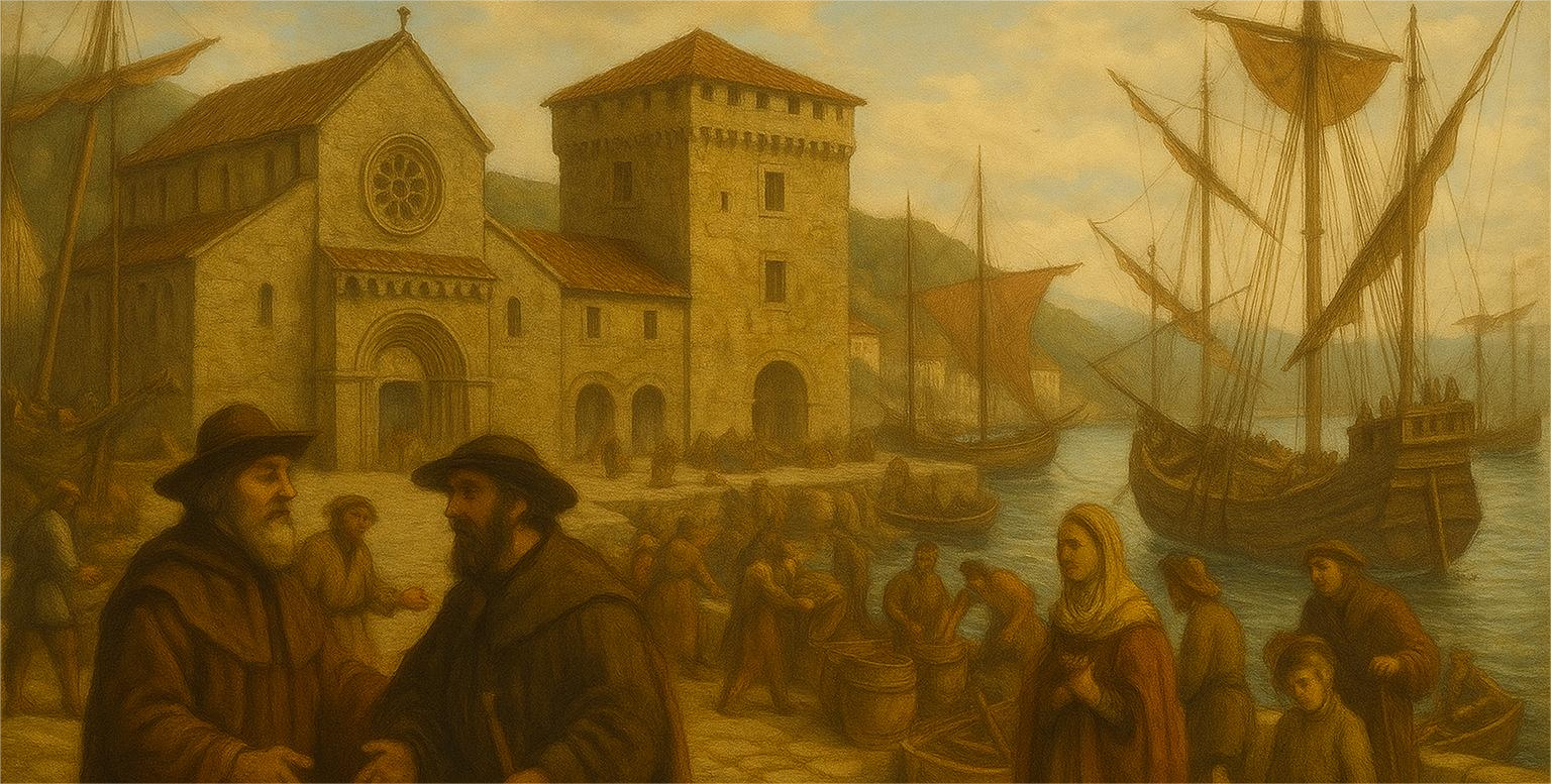 El Monasterio de Oseira, dueño y señor del Coto de Marín, era uno de los mas importantes de España de esa época. A sus almacenes llegaban inmensas rentas pagadas por los que sus tierras trabajaba., Buen vino, trigo, centeno de las tierras de interior y pescado fresco, seco o en salazón del próspero Coto de Marín. En este tiempo, época de paz, los monjes usaban en su mayor parte estos bienes para acudir en auxilio de la población necesitada en tiempos de hambruna y escasez así como a los miles de peregrinos que por allí pasaban.