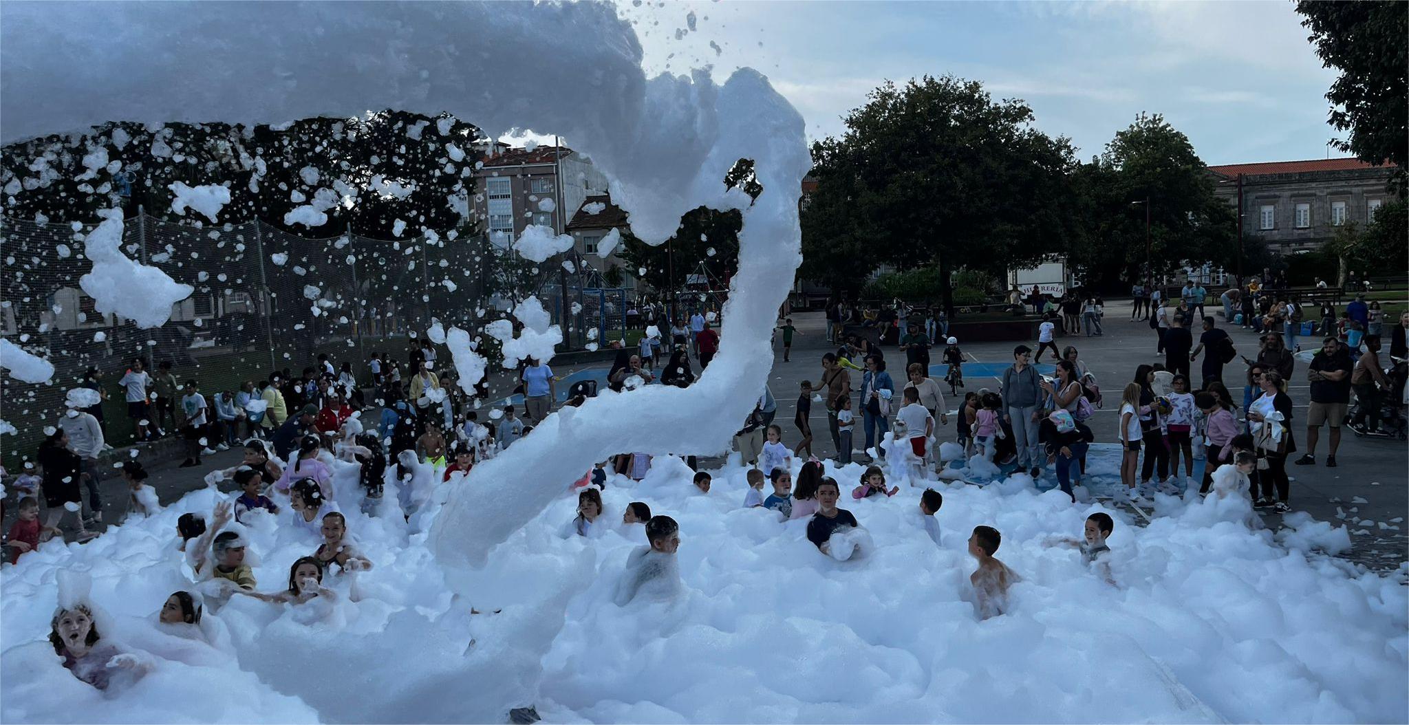 La alameda Rosalía de Castro y el Parque Eguren acogieron ayer una gran fiesta infantil organizada por “Estrela de Marín” y lcon el apoyo de la Concejalía de Comercio, como homenaje a la vuelta al cole para los chavales que endulzaron sus sentimientos disfrutando de hinchables, juegos y entretenimientos y, cómo no!, la fiesta de la espuma que llenó el foso del Parque Eguren con la chavalada dentro.