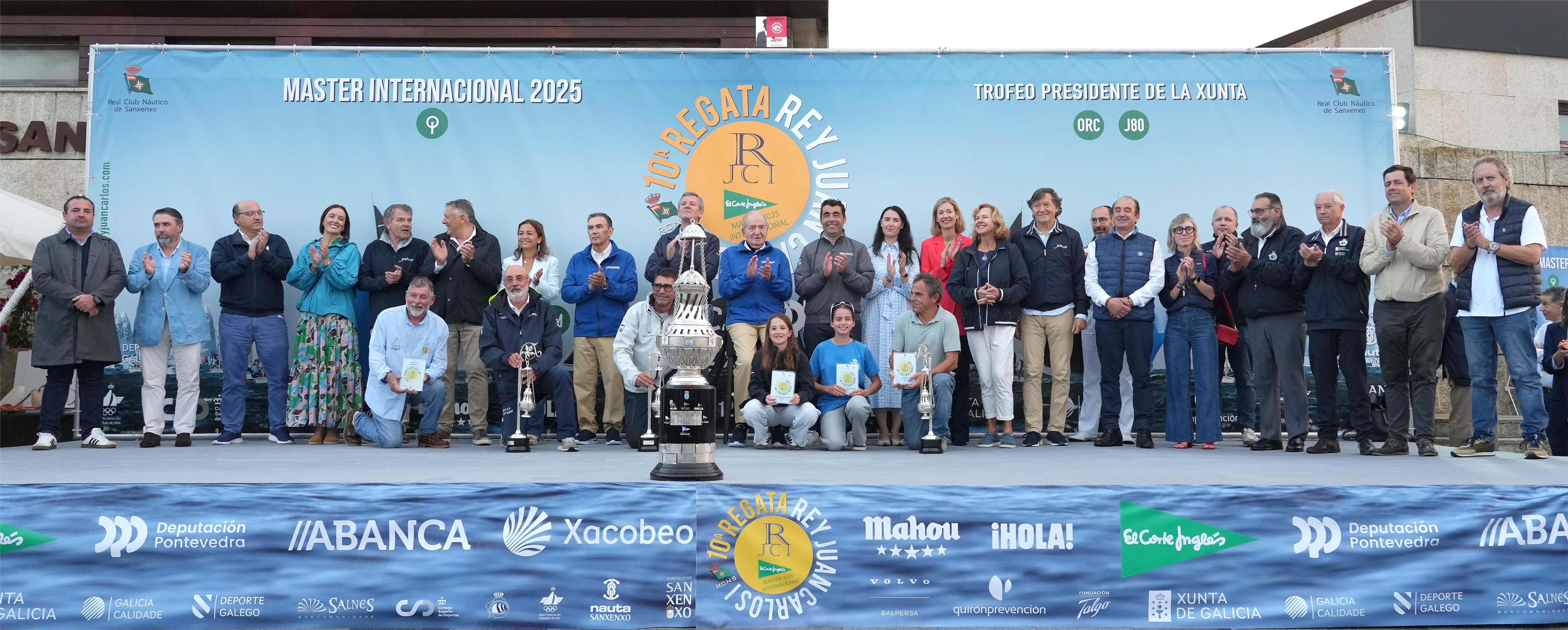 En el acto de entrega de los trofeos estuvieron, entre otras autoridades, el Rey Emérito Juan Carlos I, el Presidente de la Xunta Alfonso Rueda y el de la Diputación, Luis López y, al término del mismo posaron con los deportistas ganadores y otras personas relacionadas con la regata propiamente dicha