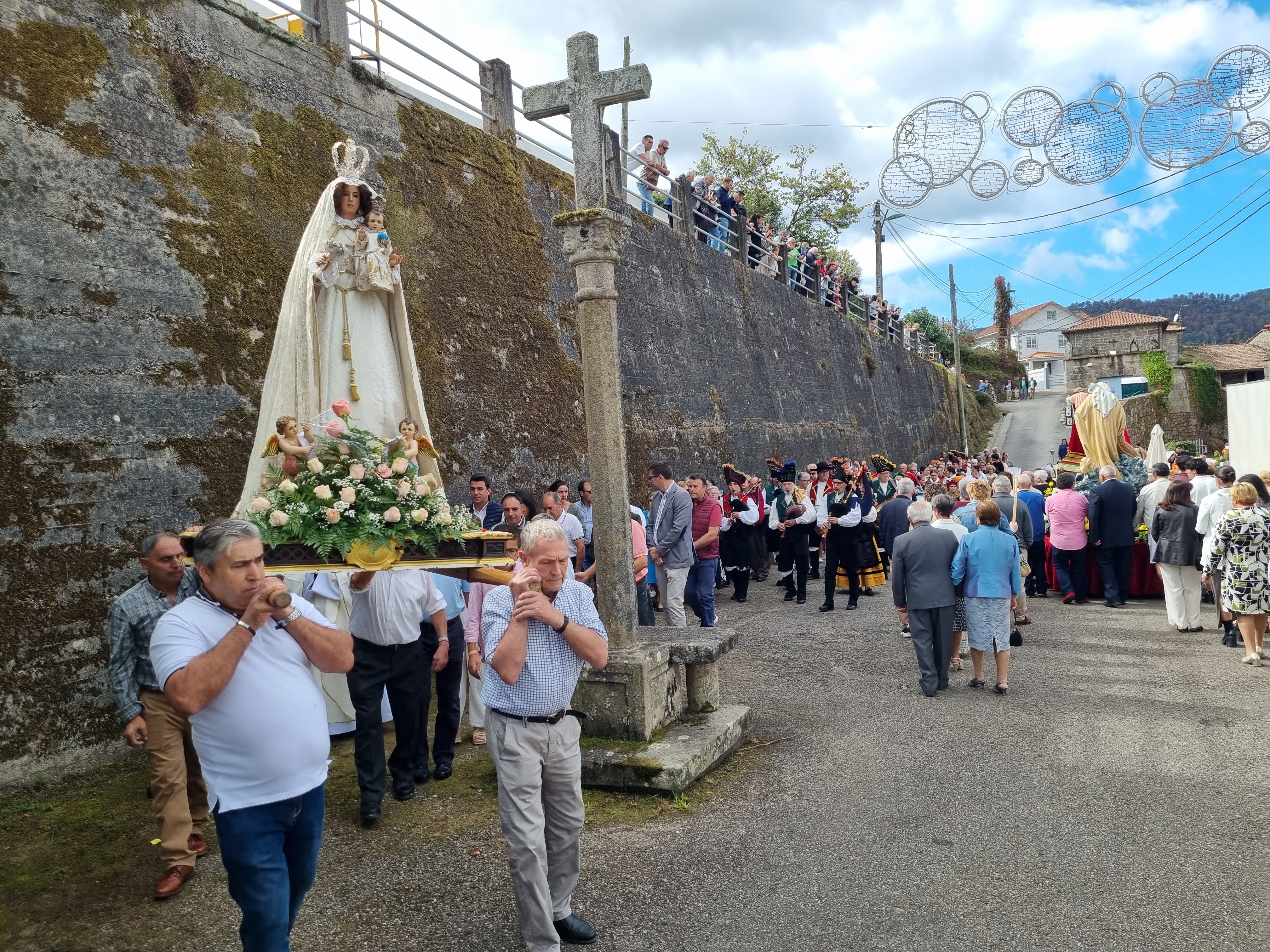 Ayer, día principal de la fiesta de la “Virgen de los Remedios” en la marinense parroquia de San Xulián, cientos de vecinos y personas que quisieron acercarse, participaron en la misa solemne y la procesión que, como es tradicional, salió tras la celebración eucarística por el itinerario externo entre el templo y el cruceiro de la plaza. La comitiva en honor de los Remedios, estuvo formada con cuatro imágenes portadas por los propios vecinos, la de San Xulián, patrón de la feligresía, en primer lugar y la Virgen de los Remedios al final, acompañada del cura párroco Ricardo Santos, tras el que estaban la alcaldesa y concejales del PP y del PSOE, vecinos participantes y el grupo de gaitas