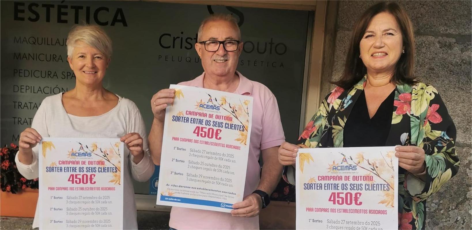 Cristina Souto y Manuel Solla, directivos de la asociación comercial ACEMAS del ámbito de Seixo y alrededores, acompañados de la concejala de comercio y turismo, Cristina Acuña, presentaron ayer la nueva iniciativa promocional que denominan “Campaña de Outono” con la que premiarán la fidelidad de los consumidores que adquieran sus productos en las distintas establecimientos asociados al colectivo.