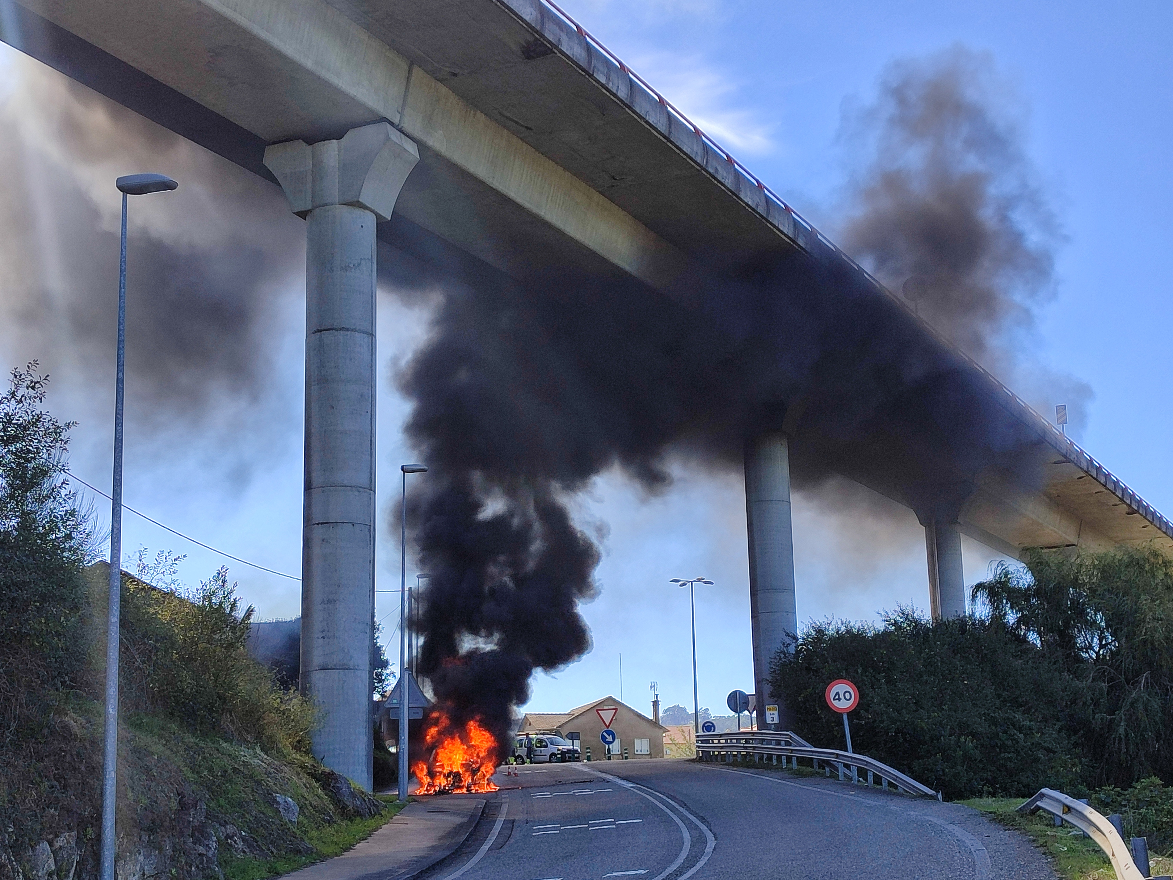 El incendio de un vehículo este mediodía en la PO313 provocó el corte de la carretera hasta que el fuego fue controlado por los Bomberos de O Morrazo.