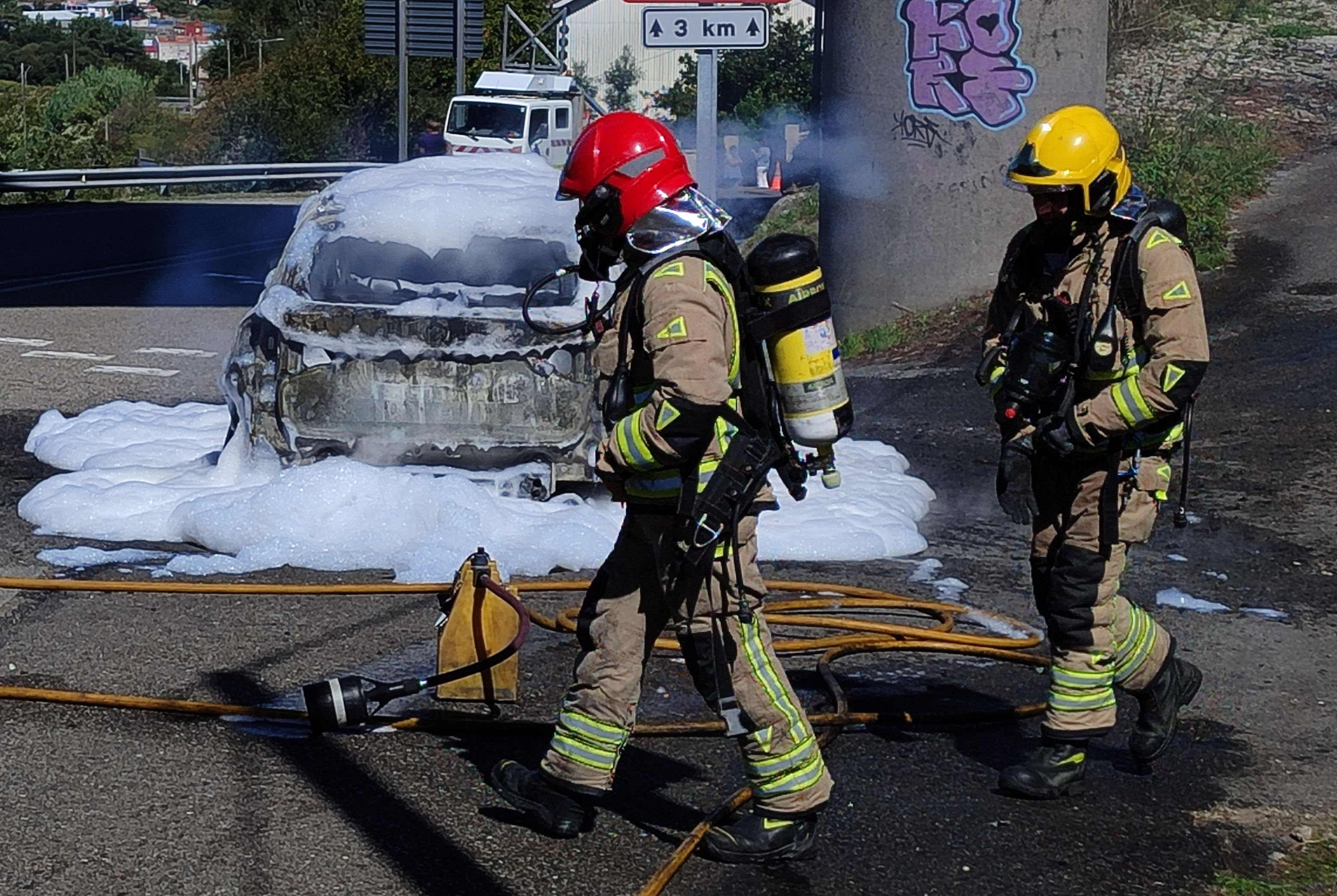 Al lugar acudió la Policía Local de Marín, que se encargó del corte de la carretera, y los propios bomberos que apagaron el incendio unos minutos después de su llegada, en un suceso que se salda únicamente con daños materiales y la pérdida del vehículo. Como curiosidad que sorprendió incluso a los bomberos, las puertas delanteras del vehículo fueron consumidas totalmente por el fuego, quizás porque están fabricadas de un material distinto que el resto de la carrocería.
