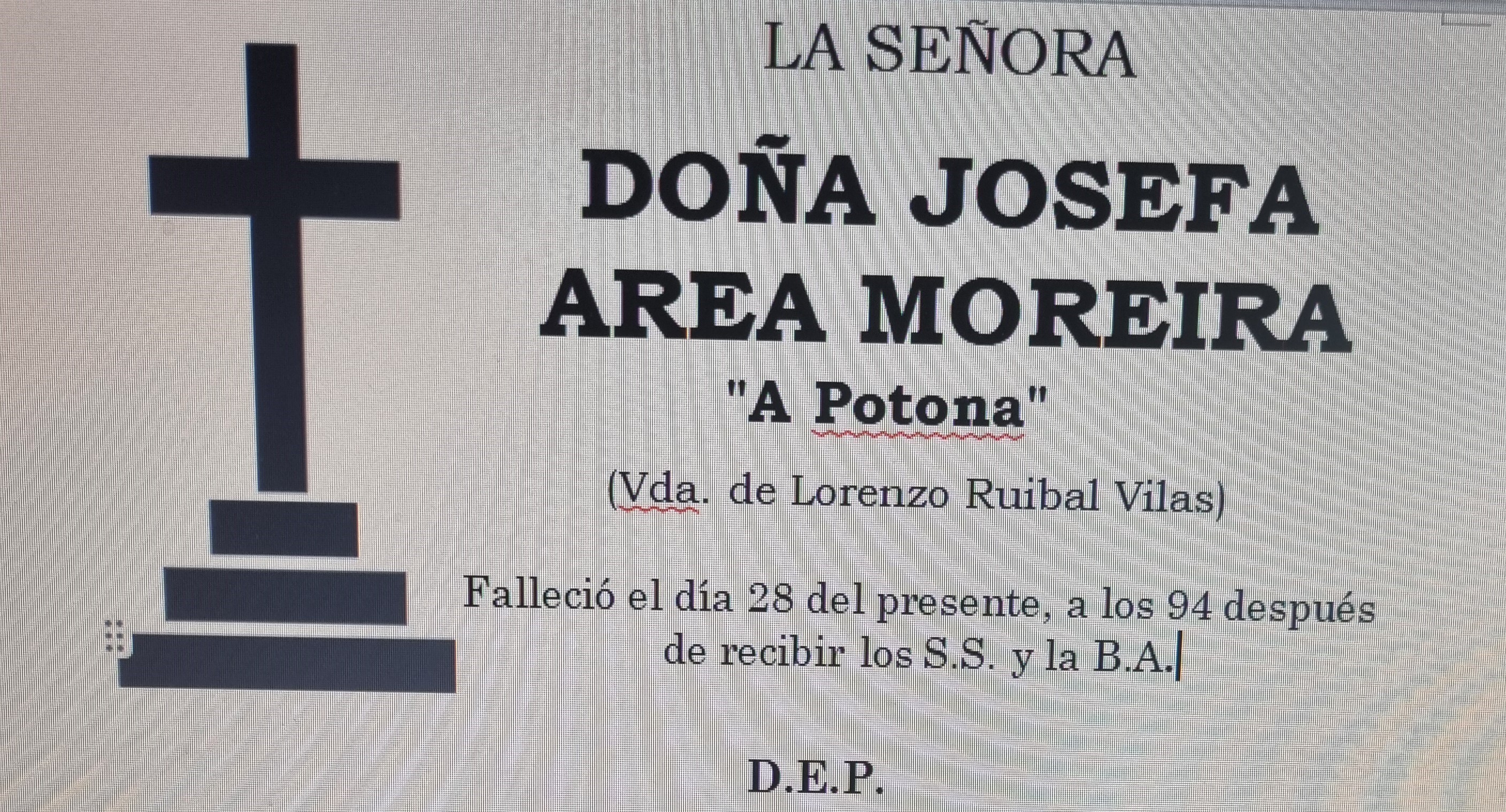 En la sala número 1 del Tanatorio San Marcos de Marín, se velan los restos mortales de Dña. Josefa Area Moreira, fallecida ayer, día 28 de Enero a los 94 años de ...