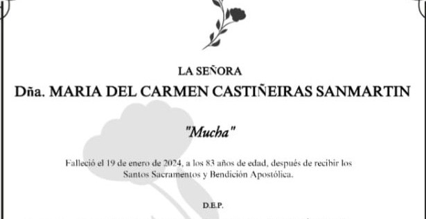 La Funeraria San Marcos comunica que, en la sala número 1 de su Tanatorio en Marín, se velan los restos mortales de Dña. María del Carmen Castiñeiras Sanmartín ...