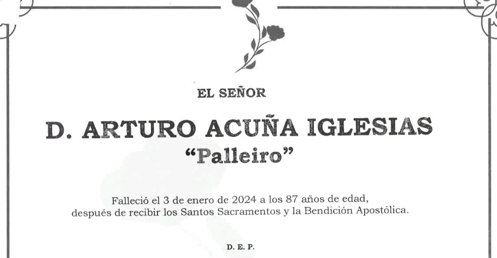 Nos comunican desde la Funeraria San Marcos el fallecimiento a los 87 años de edad de don Arturo Acuña Iglesias “Palleiro”, cuyos restos ...