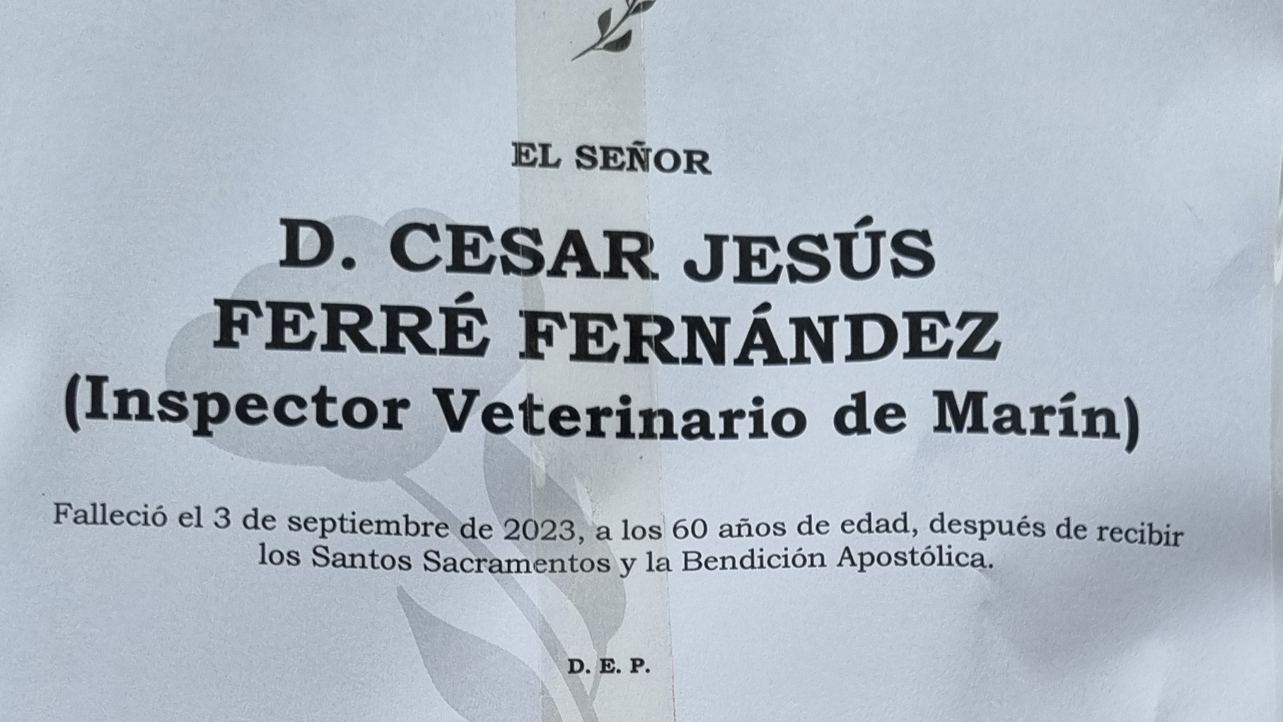 Desde la Funeraria San Marcos nos comunican el fallecimiento de D. César Jesús Ferré Fernández, Inspector Veterinario de Marín, a los sesenta años de edad.