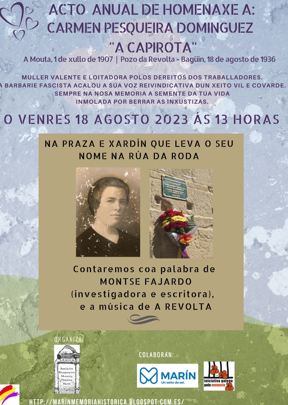 Hoxe venres día 18 lembramos a Carmen Pesqueira Domínguez "A Capirota" na praza e xardín que leva o seu nome, na rúa da Roda. No ...