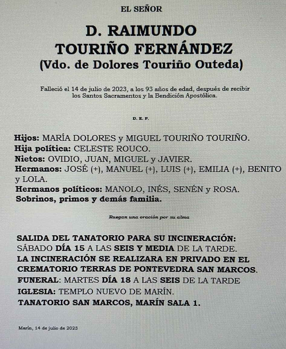 Raimundo Touriño Fernández falleció hoy con 93 años de edad y sus restos mortales se velan en el Tanatorio San Marcos de Marín hasta las seis y media de la tarde ...