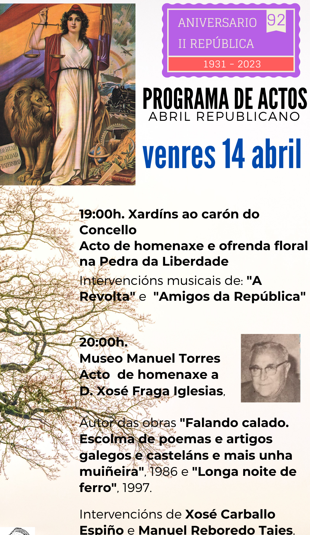 O vindeiro venres, 14 de abril, terá lugar o acto organizado pola Asociación para a Recuperación da Memoria Histórica de Marín con motivo do 92 aniversario da II ...