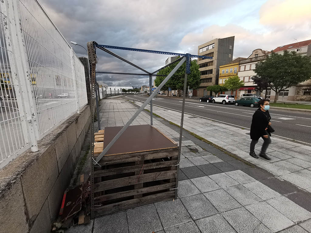 Varios avisos en la tarde de ayer de algunos viandantes que utilizan el paseo que comienza en la Avenida de Ourense y termina en Placeres, junto a la entrada principal del Puerto de Marín nos alertaban de la instalación de una especie de kiosco de venta o similar en plena acera, ya en término municipal de Pontevedra. Desconocemos el origen y el objetivo de la construcción, fabricada con restos de estanterías y pallets, pero es evidente que no es este un buen lugar para su situación.