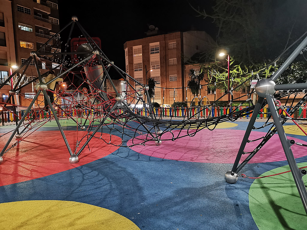 Es lógico que con el paso del tiempo las cosas se vayan desgastando y algunos elementos, como éste de la foto, terminan estropeándose. Pero en el caso que nos ocupa, por antigüedad, nada más que el mal uso, o incluso la mala fe, justifican la rotura de un robusto elemento de este parque que es prácticamente nuevo, el puente hecho de malla de cuerda que une uno de los toboganes con la pared de escalada.