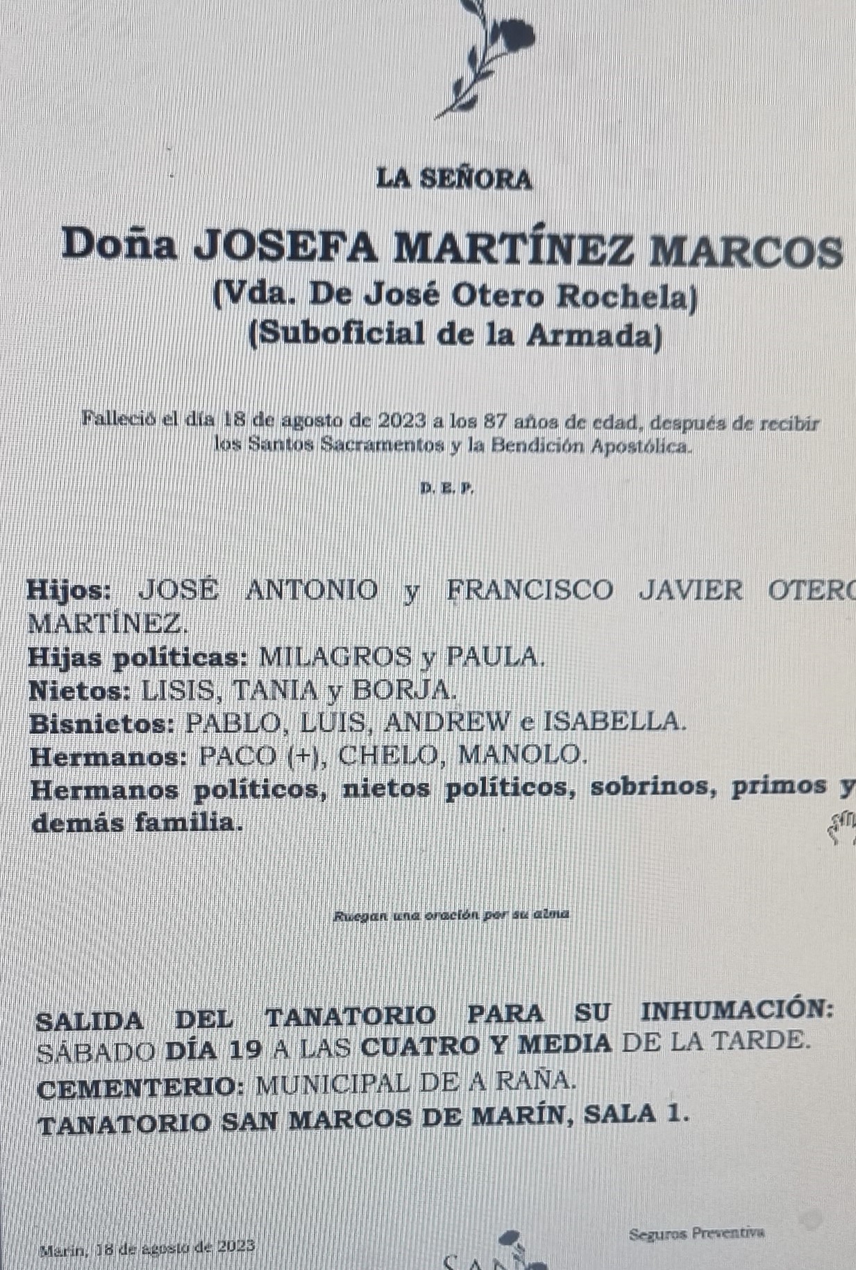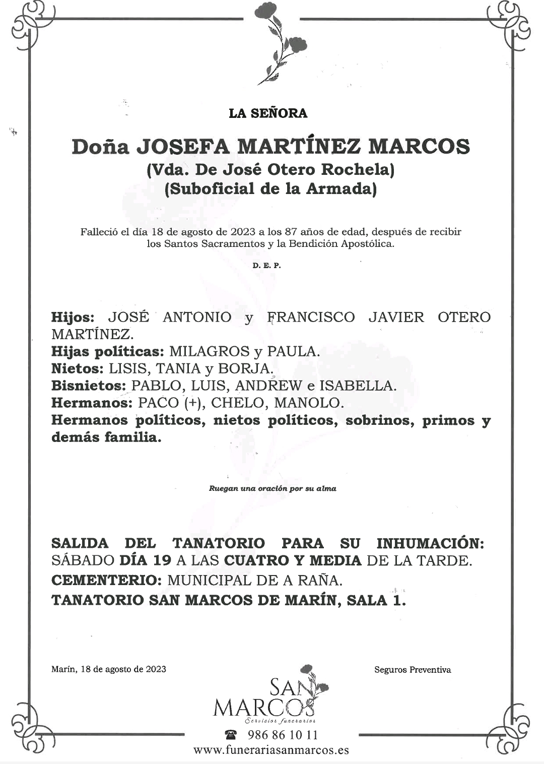 Nos comunican desde la Funeraria San Marcos el fallecimiento a los 87 años de edad de doña Josefa Martçinez Marcos cuyos restos mortales se velan en el Tanatorio de Marín hasta las cuatro de la tarde de mañana sábado en que srá trasladada el cementerio municipal de A Raña.