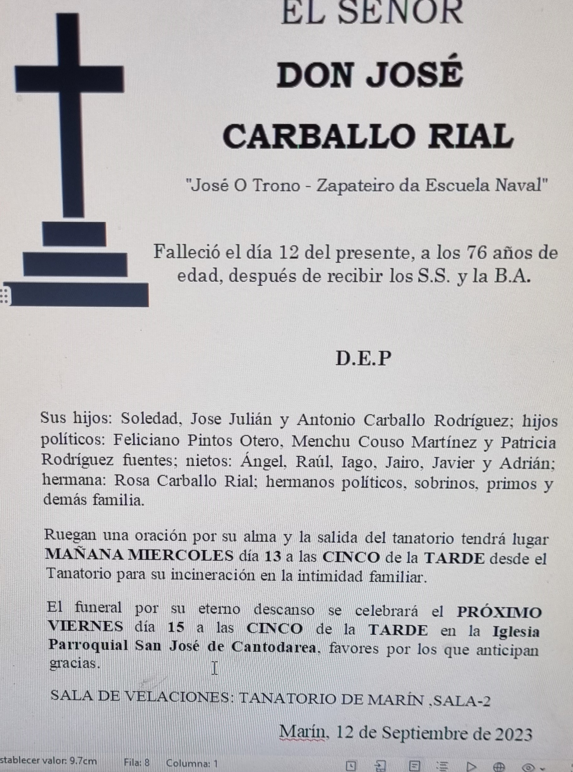 Rgistramos hoy el fallecimiento de José Carballo Rial, “O Trono”, que ejerció su labor profesional como zapatero en la Escuela Naval Militar y contaba con setenta y seis años de edad.
