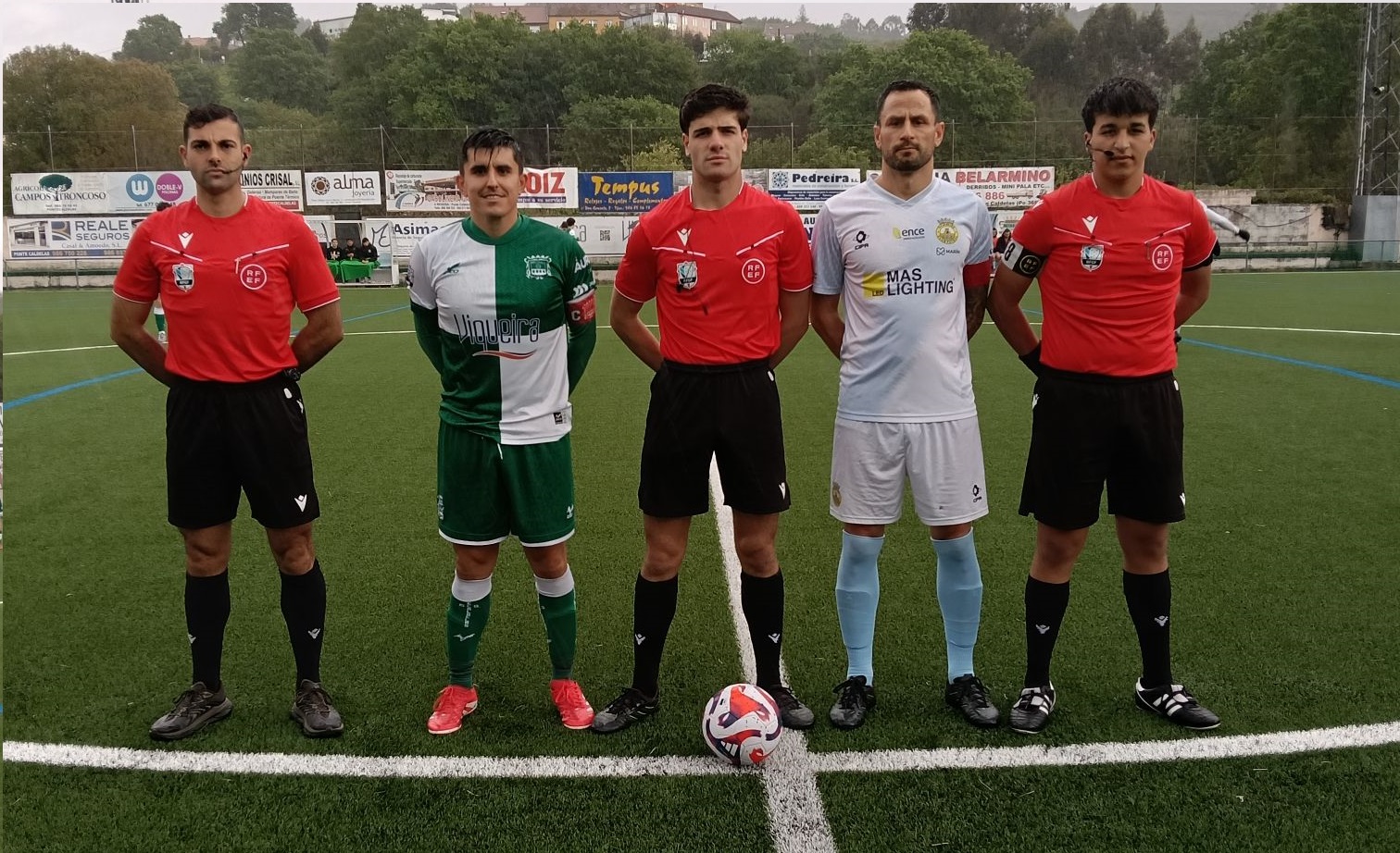 Manuel Veiras Nogueira con José Angel Andrade y Ayoub Aga ( Colegio de Pontevedra ) . Amonestó con tarjeta amarilla a los locales Lou , Charly y Raúl y a los visitantes Nico y Alex Rey .