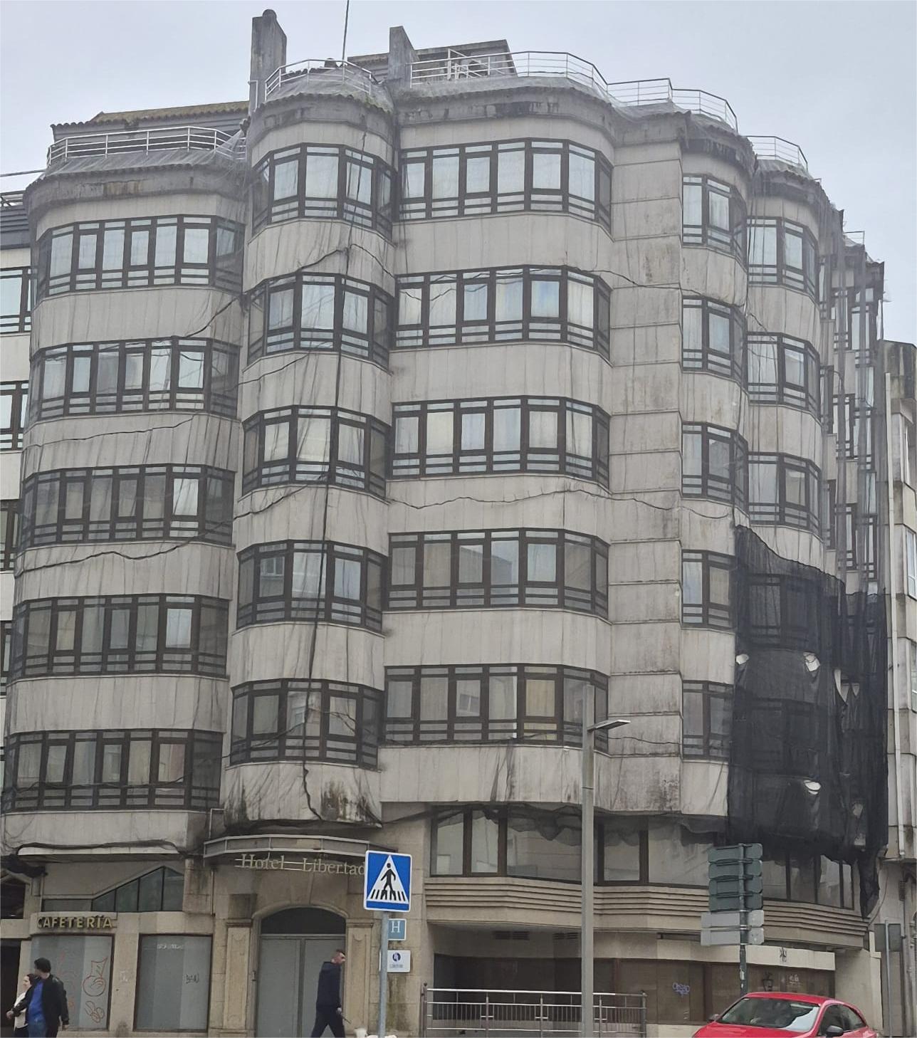 Este edificio fue un hotel, el Hotel Libertad, que prometía y, en algún momento, tuvo brillo turístico pero, por los problemas urbanísticos que al parecer contenía o por otras causas, se quedó sin actividad y, según se sonó, fue adquirido por una empresa que encabeza un personaje importante en el F.C. Barcelona. El caso es que lleva años “envuelto” en una malla con la que se intenta evitar perjuicios a causa de los desprendimientos que puedan suceder en las losas de la fachada y también que allí albergan palomas y otros bichos que no son turistas, precisamente.