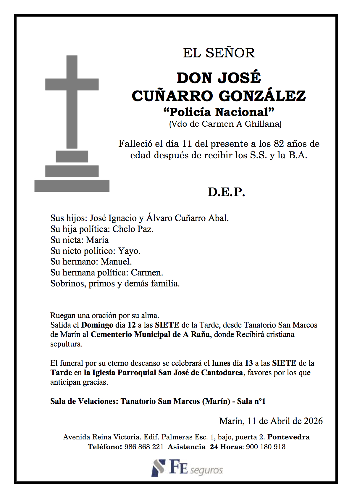 La funeraria LA FE comunica el fallecimiento HOY, día 11 de abril de don JOSÉ CUÑARRO GONZÁLEZ cuyos restos mortales permanecerán en el Tanatorio San Marcos, de Marín, sala número 1, hasta el momento de su traslado mañana DOMINGO día 12 a las SIETE de la tarde al cementerio municipal de A Raña para su inhumación.