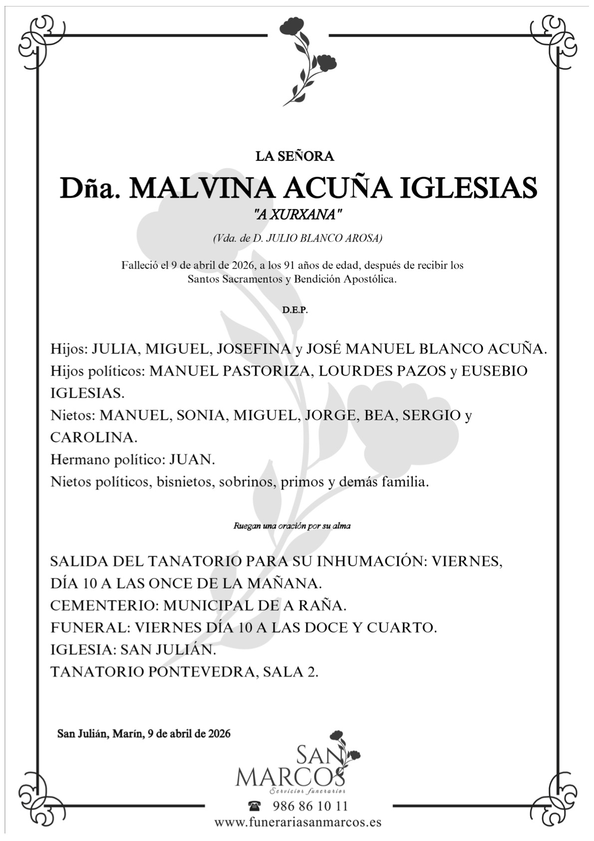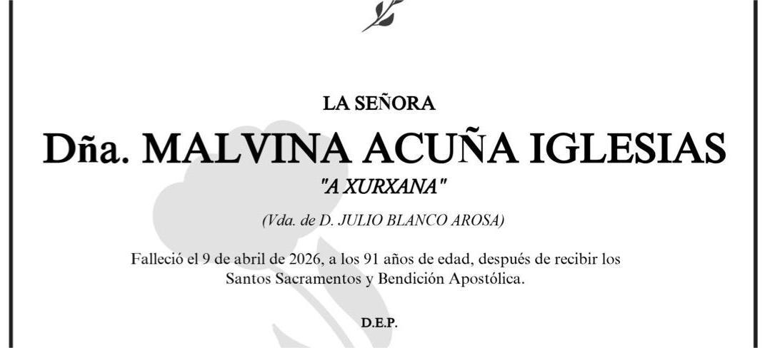 La funeraria SAN MARCOS comunica el fallecimiento HOY, día 9 de abril de doña MALVINA ACUÑA IGLESIAS cuyos restos mortales permanecerán en el Tanatorio San Marcos, de PONTEVEDRA, sala número 2, hasta el momento de su traslado mañana VIERNES día 10 a las ONCE de mañana al cementerio municipal de A Raña .