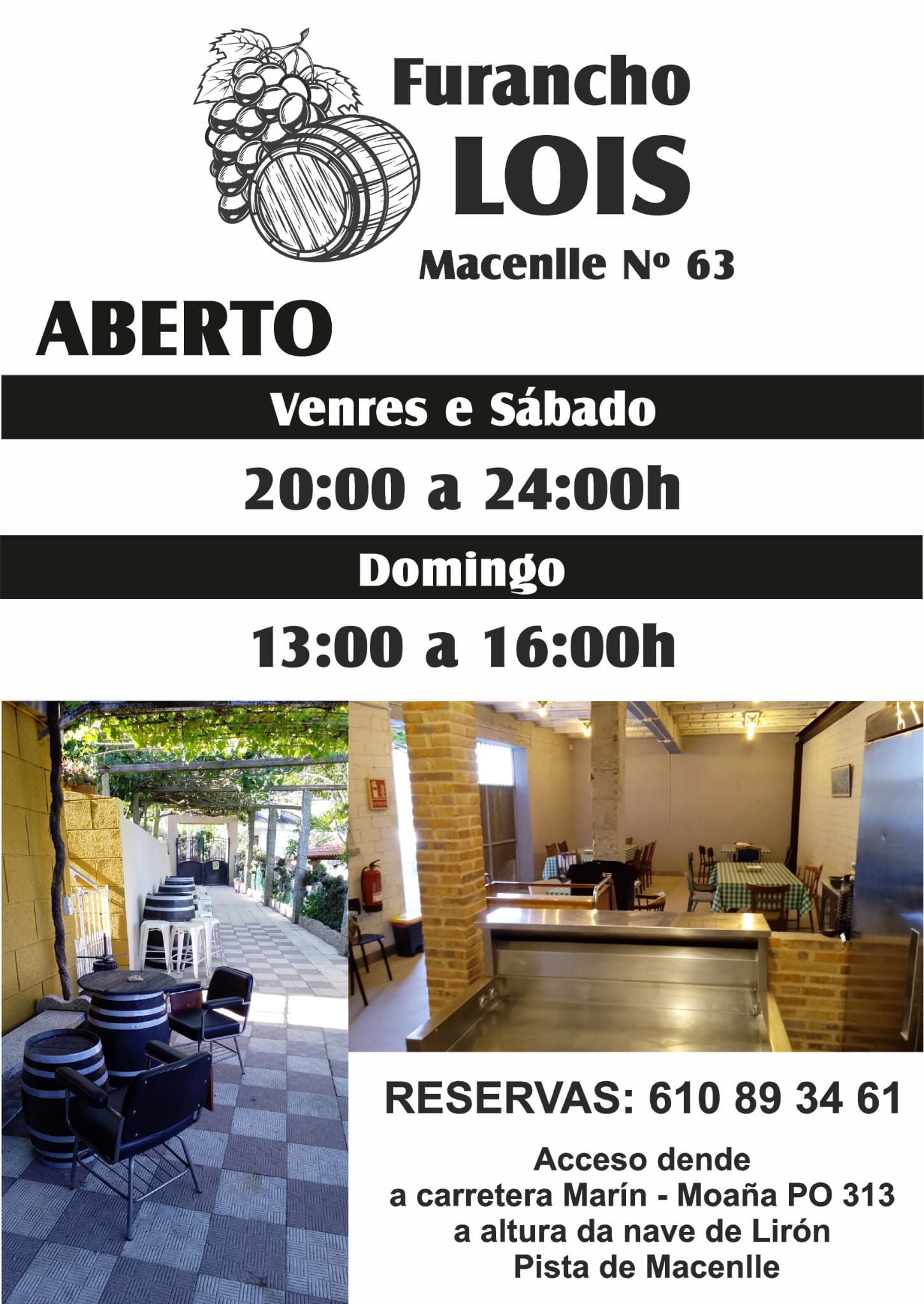 El propio Lois nos indica que “O Furancho abrirá ao publico os venres e os sábados das 20.00 ás 24.00 horas e os domingos de 13.00 a 16.00 e dispoñemos dun aparcadoiro nunha finca desde a que se chega directamente ao Furancho. Ademáis, as persoas con mobilidade reducida poden acceder perfectamente desde a entrada principal”.