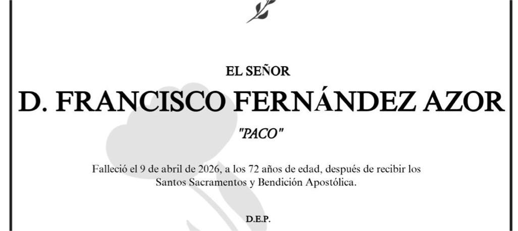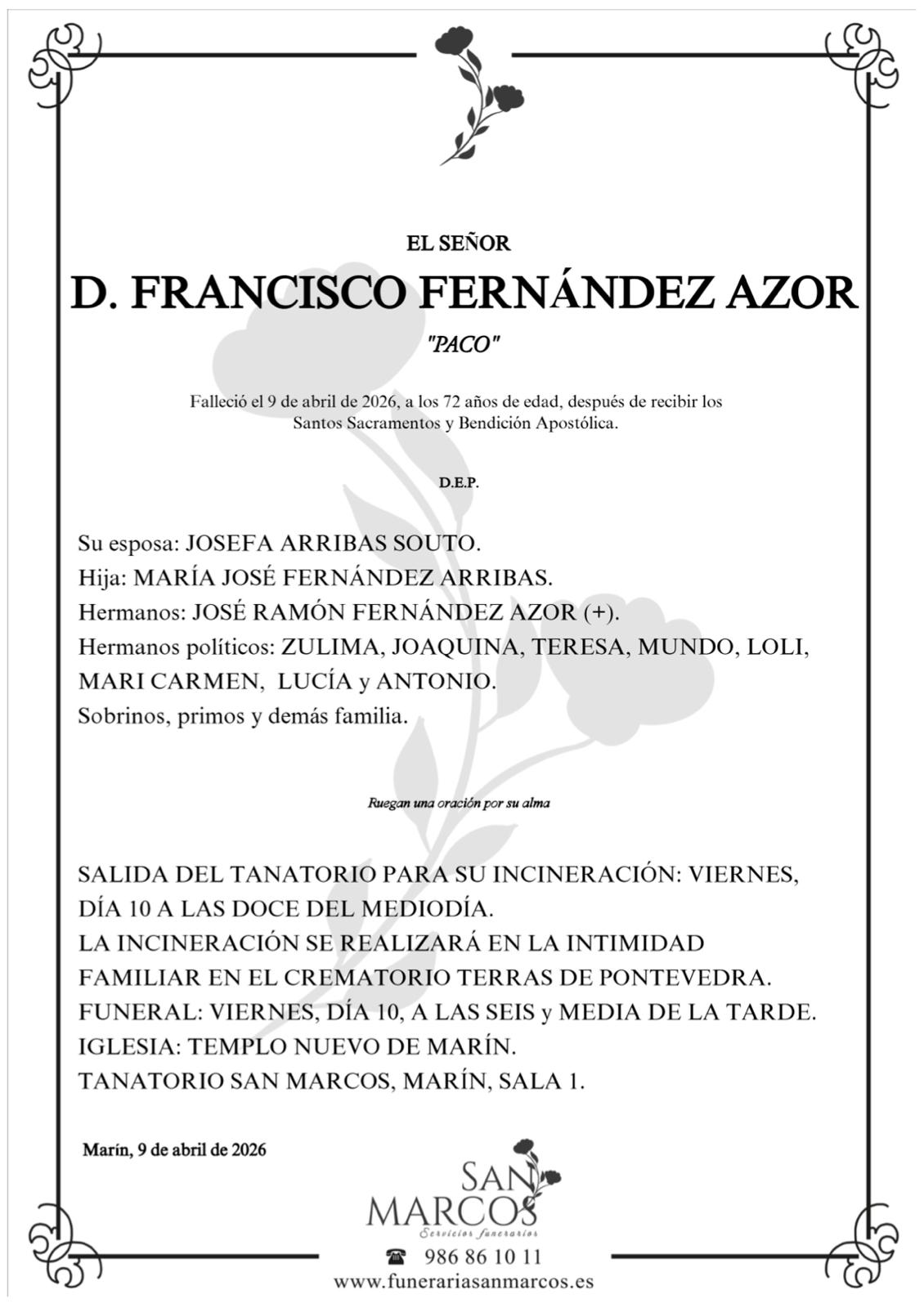 La funeraria SAN MARCOS comunica el fallecimiento HOY, día 9 de abril de don FRANCISCO FERNÁNDEZ AZOR cuyos restos mortales permanecerán en el Tanatorio San Marcos, de Marín, sala número 1, hasta el momento de su traslado mañana VIERNES día 10 a las DOCE del mediodía para su incineración en el crematorio Terras de Pontevedra en la intimidad familiar.