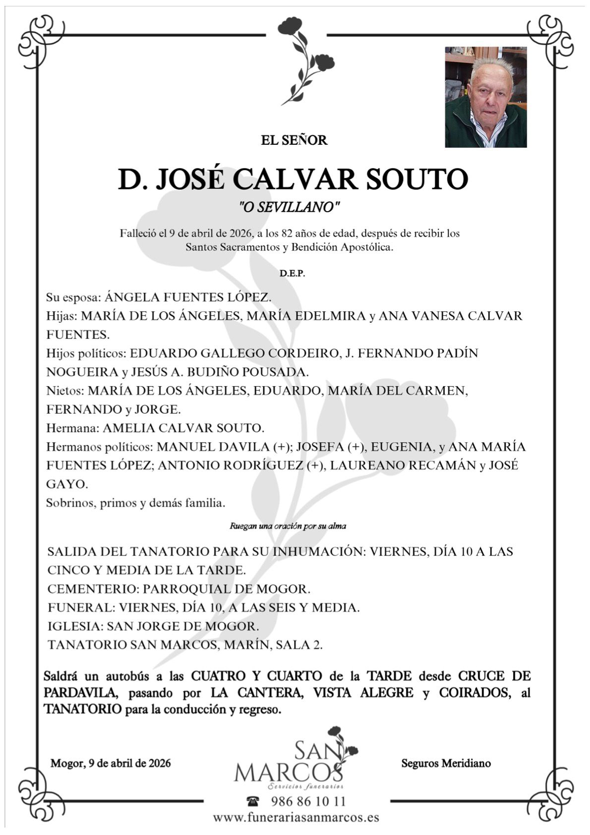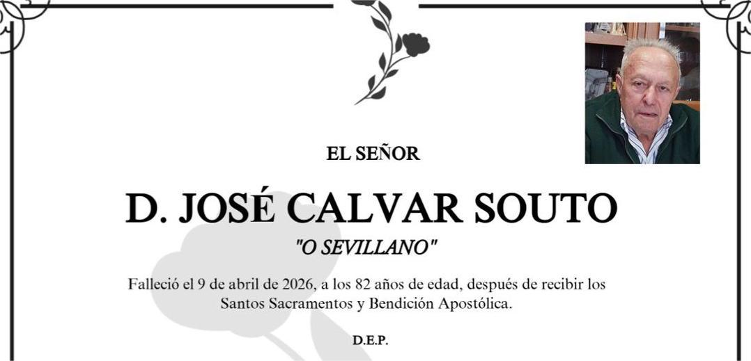 La funeraria SAN MARCOS comunica el fallecimiento HOY, día 9 de abril de don JOSÉ CALVAR SOUTO cuyos restos mortales permanecerán en el Tanatorio San Marcos, de Marín, sala número 2, hasta el momento de su traslado mañana VIERNES día 10 a las CINCO Y MEDIA de la tarde al cementerio parroquial de Mogor para su inhumación.