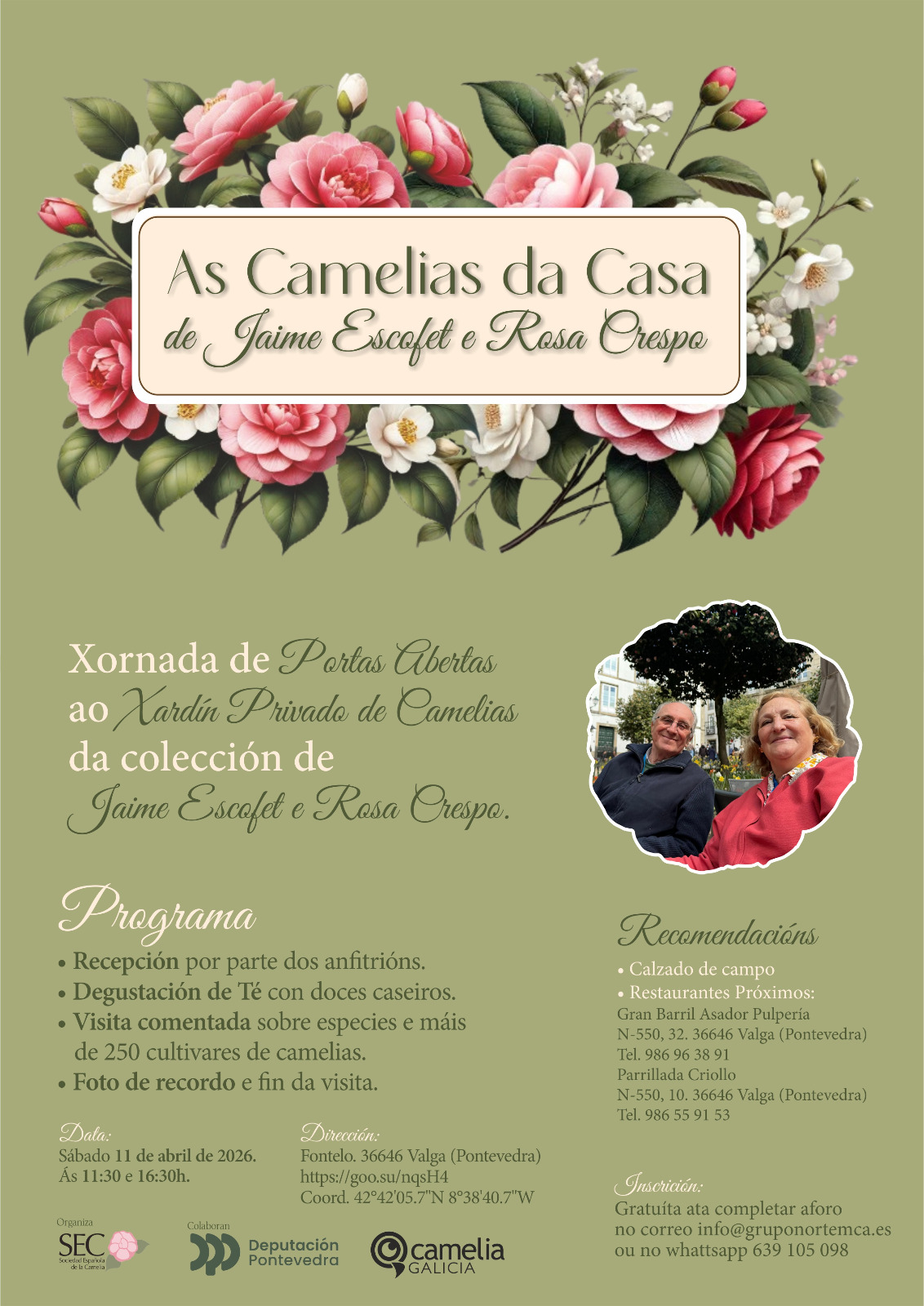 El jardín se sitúa en “Fontenlo”, (Valga) y, Rosa y Jaime recuerdan a quienes quieran hacer la visita que deberán ir pertrechados con calzado adecuado para el campo e informan que el programa de la visita se iniciará con la recepción por parte de ambos; una degustación de Té con dulces caseros; la visita comentada a más de 250 cultivares de camelias y, al remate, final de plasmar la reunión con una foto de familia.