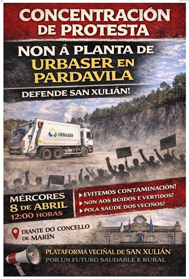 Desde ás doce do mediodía al como estaba na convocatoria, un nutrido número de veciños e veciñas de San Xulián concentráronse diante do edificio do concello de Marín para expresar oo seu rexeitamento á pretensión da instalación dun aparcadoiro, taller, lavadoiro de camións e punto limpo da empresa URBASER na antiga Canteira de Pardavila.