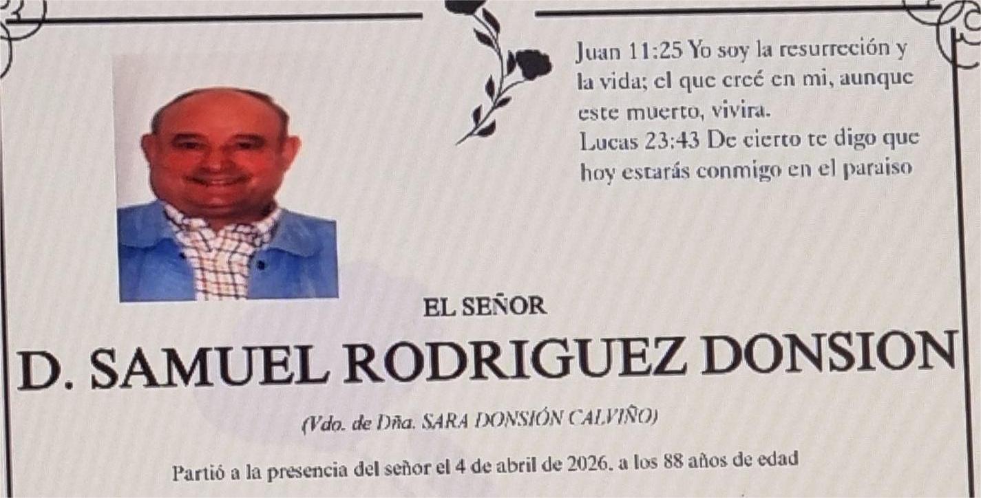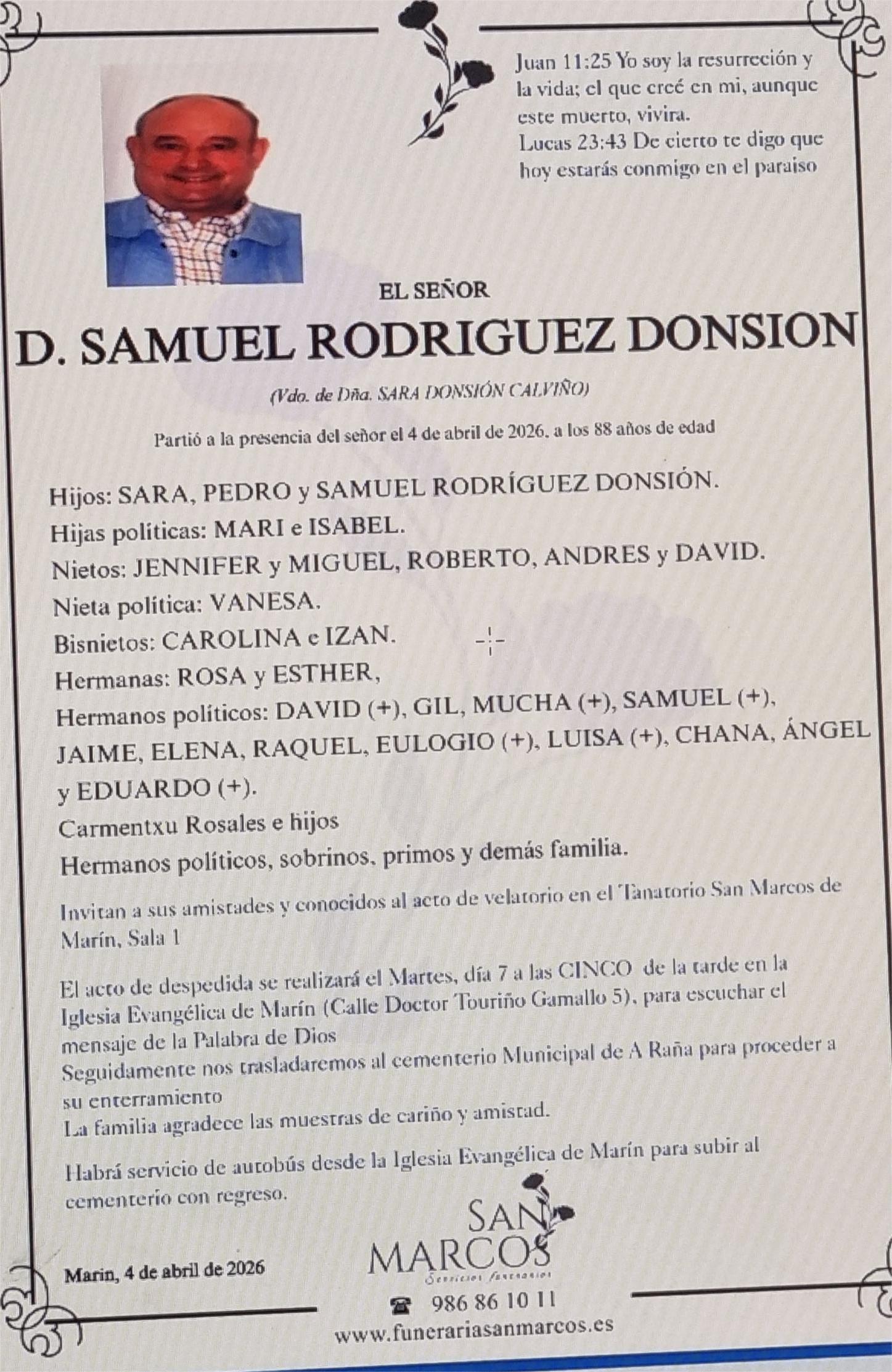 La funeraria SAN MARCOS comunica el fallecimiento el día 4 de abril, de don SAMUEL RODRÍGUEZ DONSIÓN cuyos restos mortales permanecerán en el Tanatorio San Marcos, de Marín, sala número 1, hasta el momento de su traslado mañana MARTES día 7 a las CINCO de la tarde a la Iglesia Evangélica de Marín para escuchar el mensaje de la Palabra de Dios, y su posterior traslado al cementerio municipal de A RAÑA para su enterramiento.
